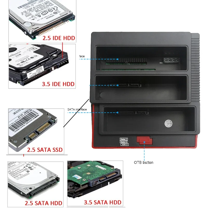 2. Soporta IDE disco duro de 2,5 pulgadas y 3,5 pulgadas. Soporta Disco Duro SATAI / II / III de 2,5 pulgadas y 3,5 pulgadas, potencia de entrada: DC / 12V.