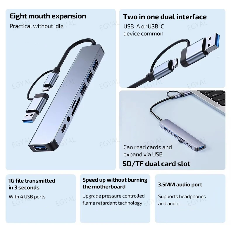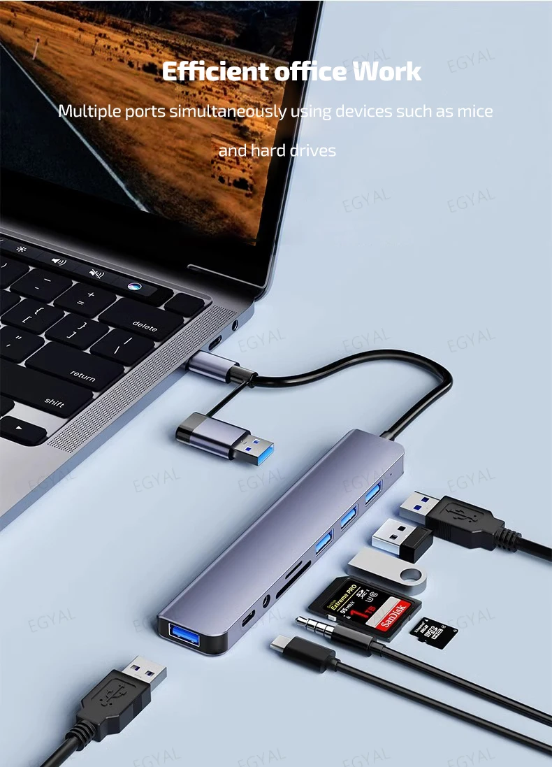 Versátil 8 en 1: Este extensor de concentrador de Puerto USB y divisor USB expande instantáneamente la conectividad de su computadora portátil, tableta o teléfono inteligente con 8 puertos esenciales, incluyendo USB y ranuras para tarjetas SD, lo que le permite conectar varios dispositivos y periféricos para aumentar la productividad y la comodidad.