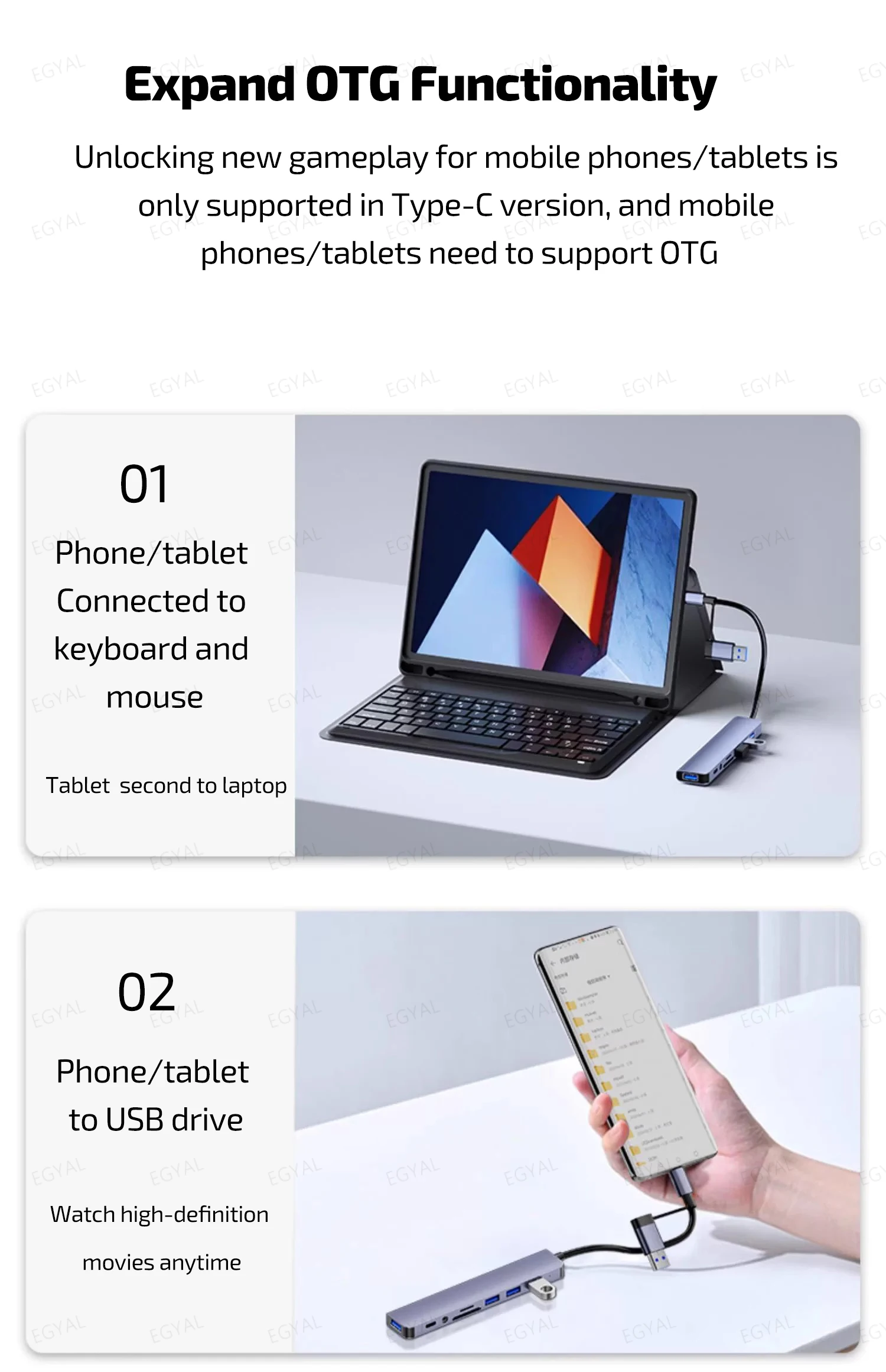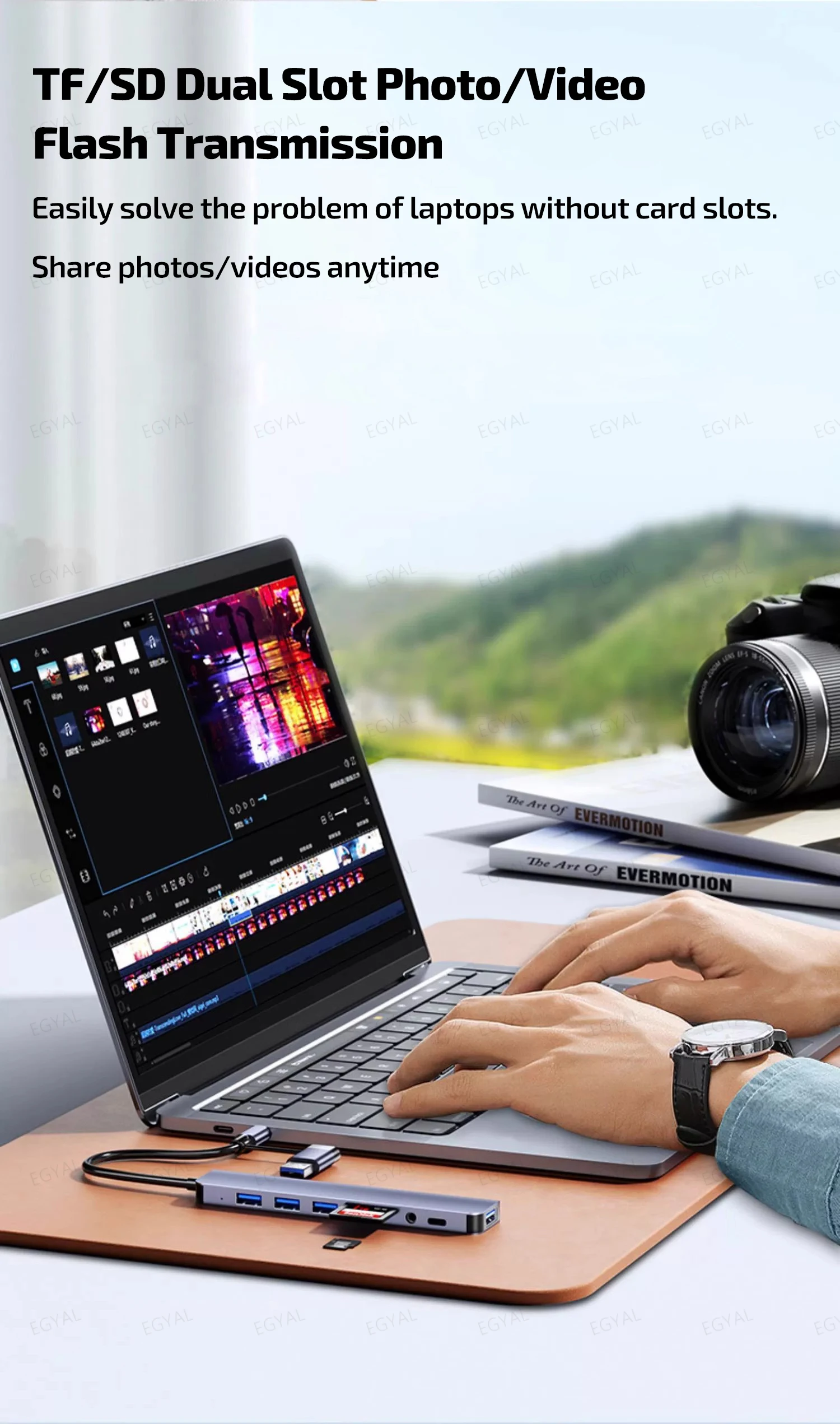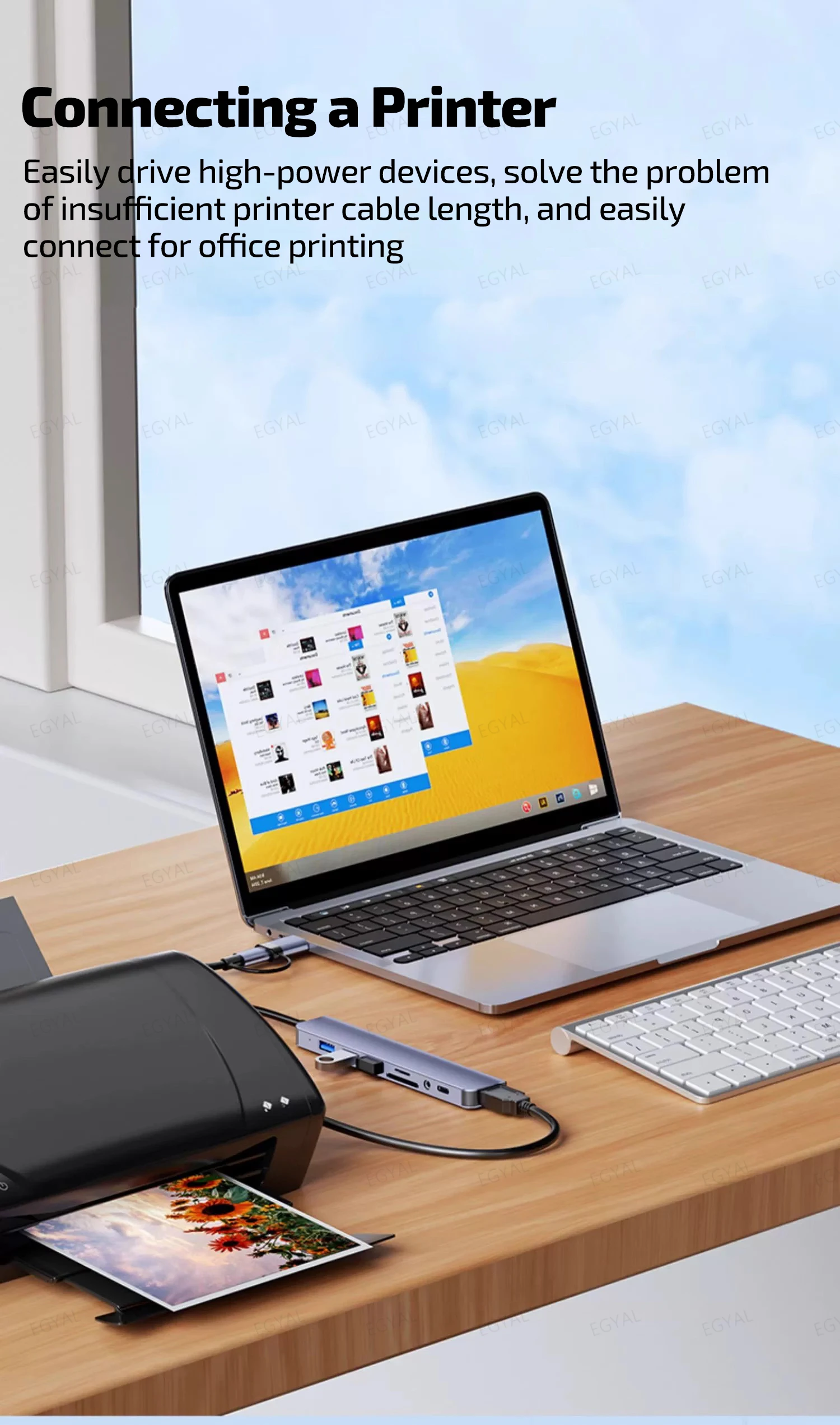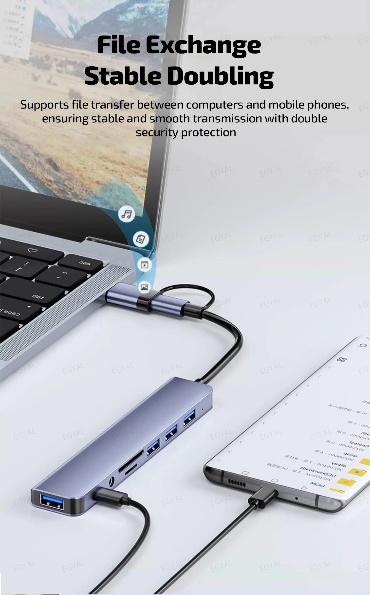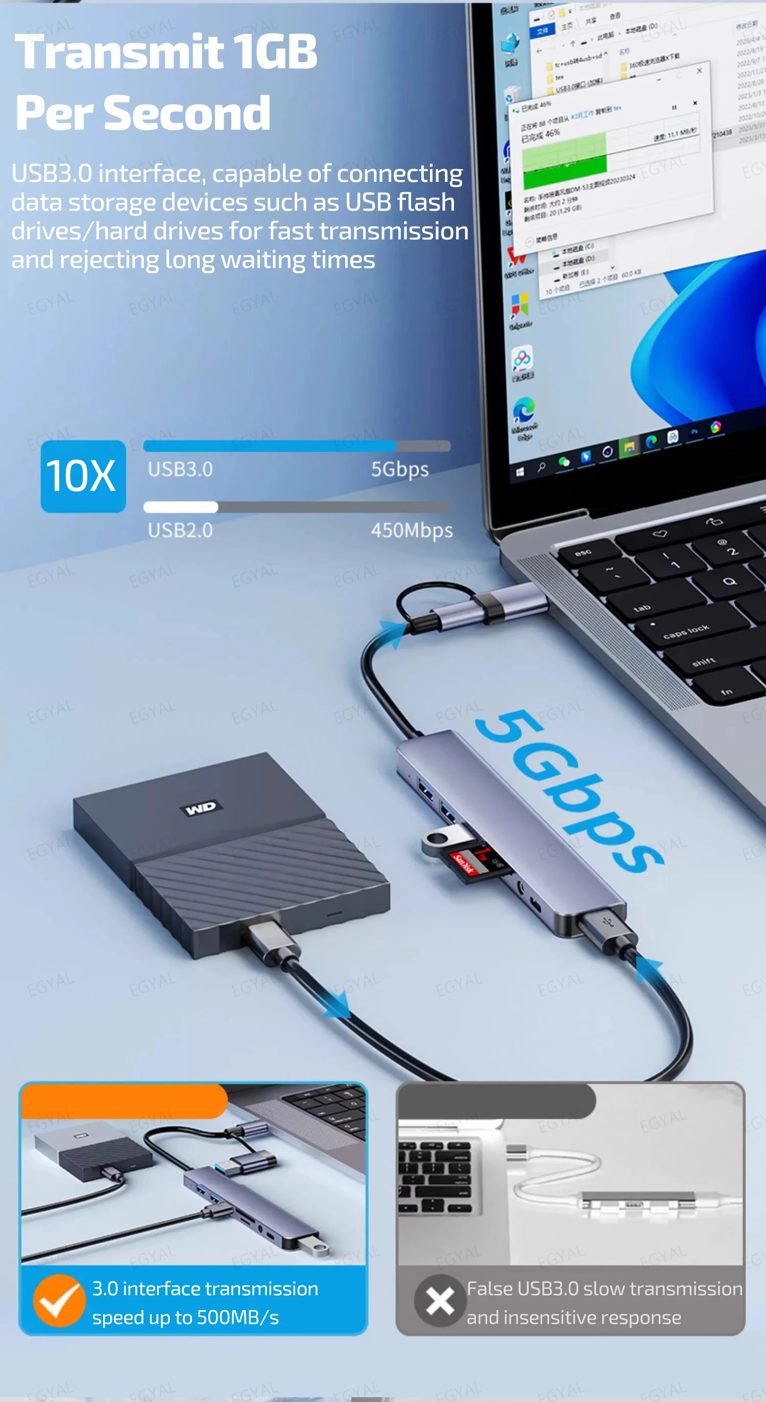 Puerto USB múltiple de alta velocidad:Este concentrador USB C y Concentrador USB equipado con múltiples puertos USB 3,0, este concentrador permite velocidades de transferencia de datos rápidas de hasta 5Gbps, lo que le permite transferir archivos grandes, fotos, y vídeos en segundos. Disfruta de un flujo de trabajo eficiente y sin problemas con esta potente base de expansión.