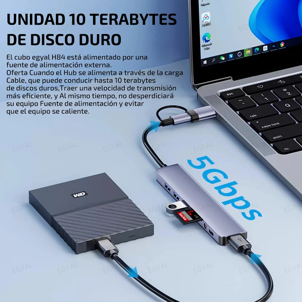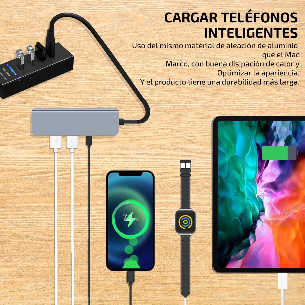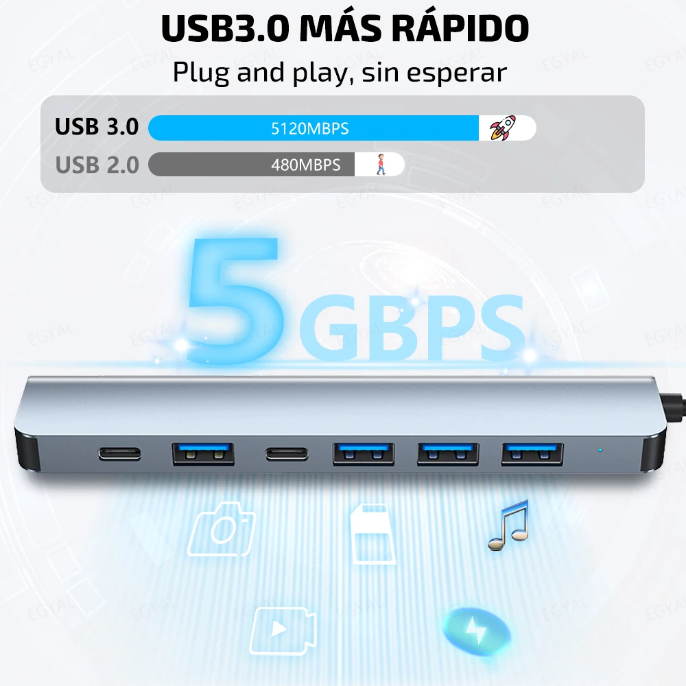 Puerto USB múltiple de alta velocidad:Este concentrador USB C y Concentrador USB equipado con múltiples puertos USB 3,0, este concentrador permite velocidades de transferencia de datos rápidas de hasta 5Gbps, lo que le permite transferir archivos grandes, fotos, y vídeos en segundos. Disfruta de un flujo de trabajo eficiente y sin problemas con esta potente base de expansión.