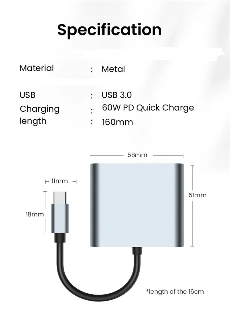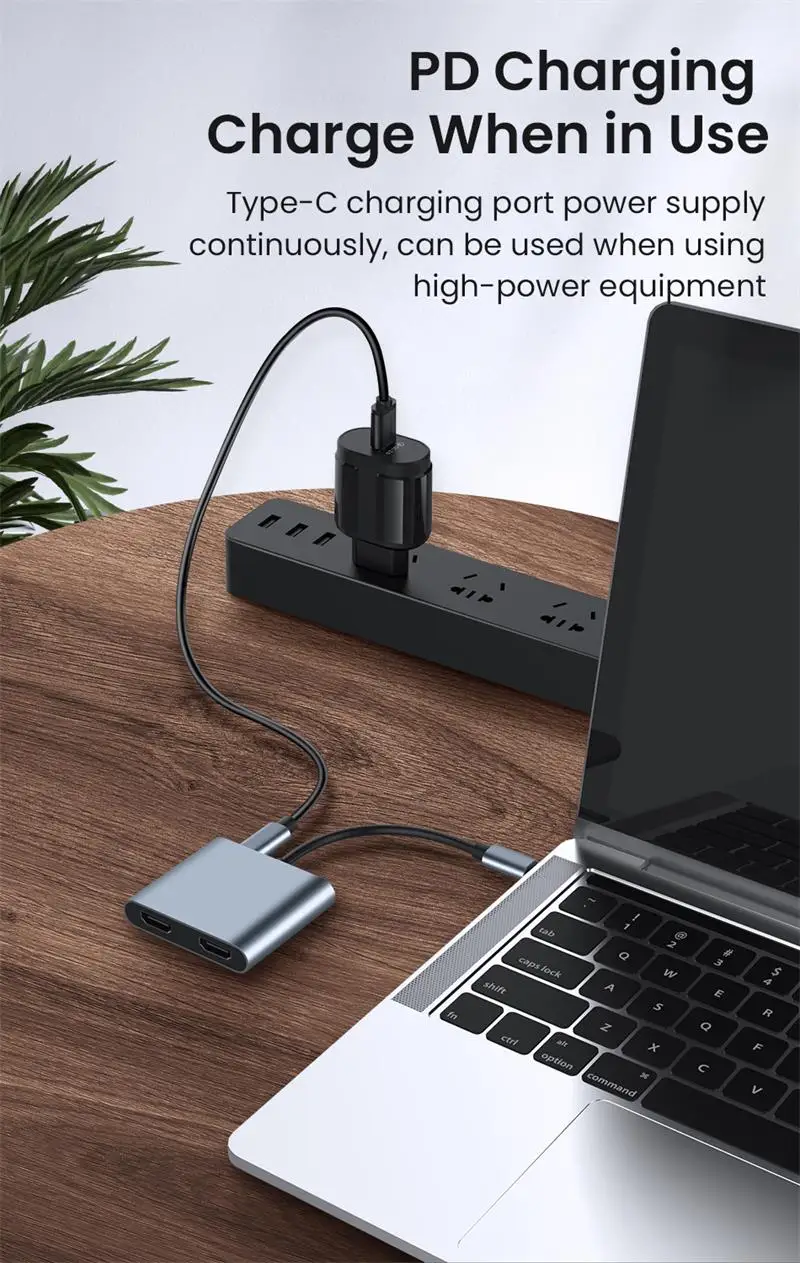 El adaptador USB C a Dual HD conecta los dispositivos con un puerto de interfaz USB-C a dos puertos HD, un puerto USB 3.0 y un puerto PD.Cuatro puertos pueden funcionar al mismo tiempo.