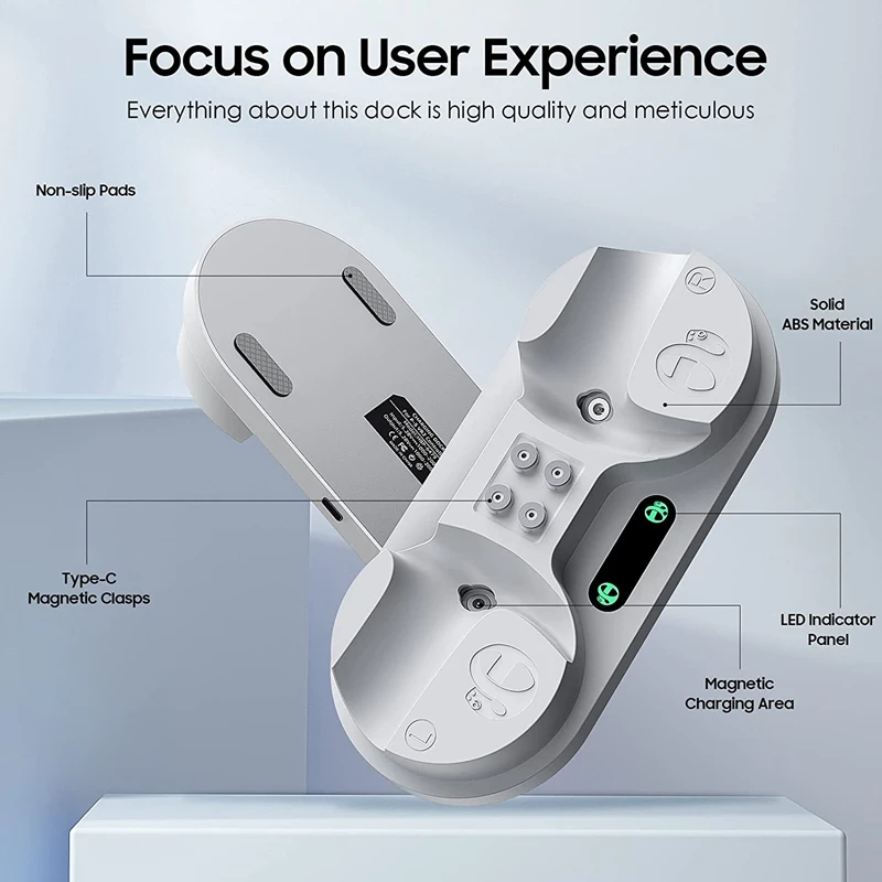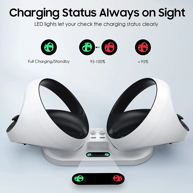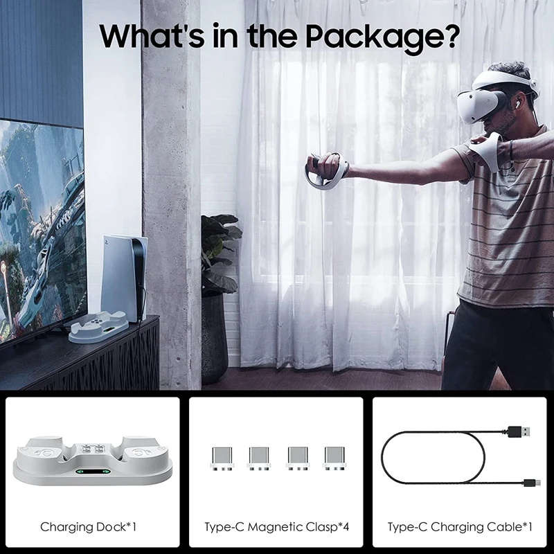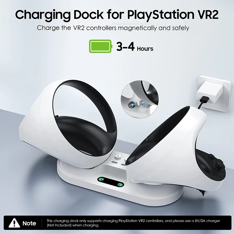 [Accesorios esenciales para PS VR2] especialmente diseñados para el controlador PlayStation VR2. El soporte de carga puede cargar 2 controladores al mismo tiempo, y el cabezal adaptador aplicable es de 5V 3A (no incluido en el paquete). Carga completa en 3-4 horas. [4 hebillas magnéticas tipo C] La base del cargador para PS VR2 está equipada con hebillas magnéticas tipo C, que son muy fáciles de usar. Simplemente conéctelo al puerto de carga y luego Alinee el puerto de carga del controlador con la base de carga. El Puerto del muelle cuenta con material de microsucción para mantenerlo en su lugar para una carga segura. [Indicadores LED] Hay dos indicadores en la parte frontal del soporte de carga para mostrar el estado de carga. Al cargar, la luz indicadora es roja, y cuando la carga alcance 95-100%, la luz indicadora parpadeará alternativamente en verde y rojo. Si la luz permanece verde, el controlador está en modo de carga completa. [Soporte de escritorio estable] Hay cuatro almohadillas antideslizantes en la parte inferior de la base de carga, puede colocar el controlador en él para cargar sin volcarse o deslizarse debido a la fuerza externa. Sostiene sus controladores de forma segura y mantiene su escritorio ordenado. [Ahorro de espacio] Esta estación de carga es pequeña y ocupa muy poco espacio cuando se usa en casa. También es muy portátil si alguna vez lo necesitas.