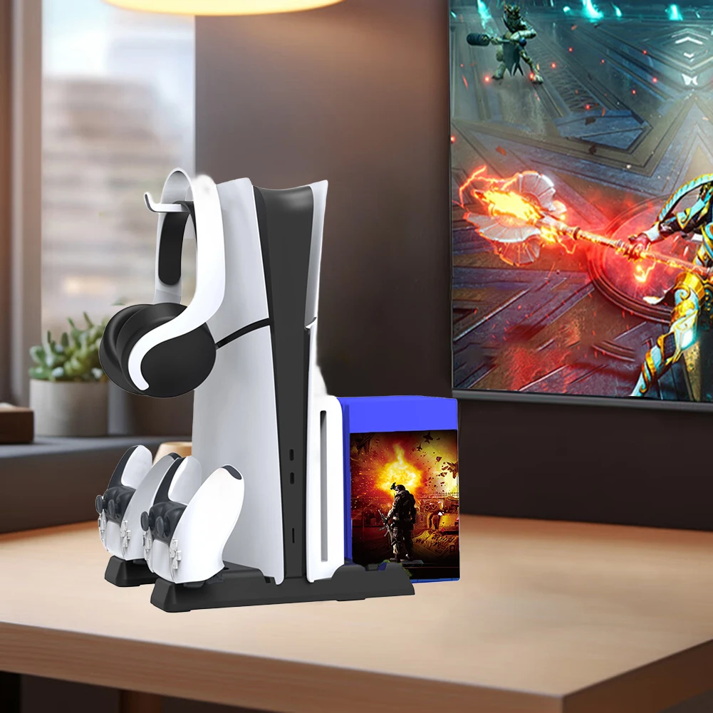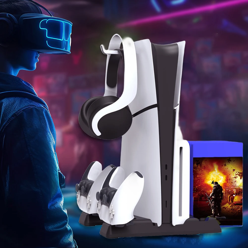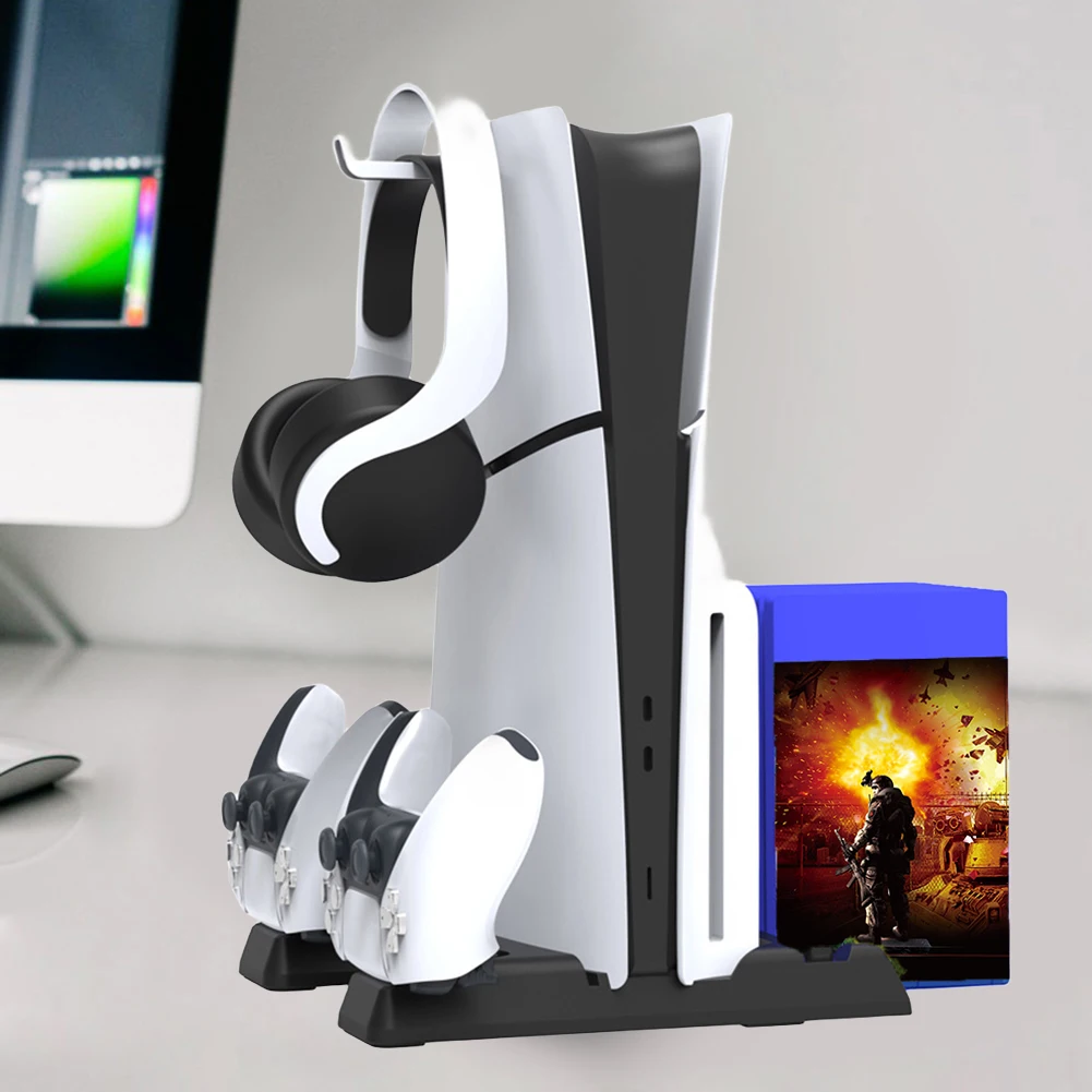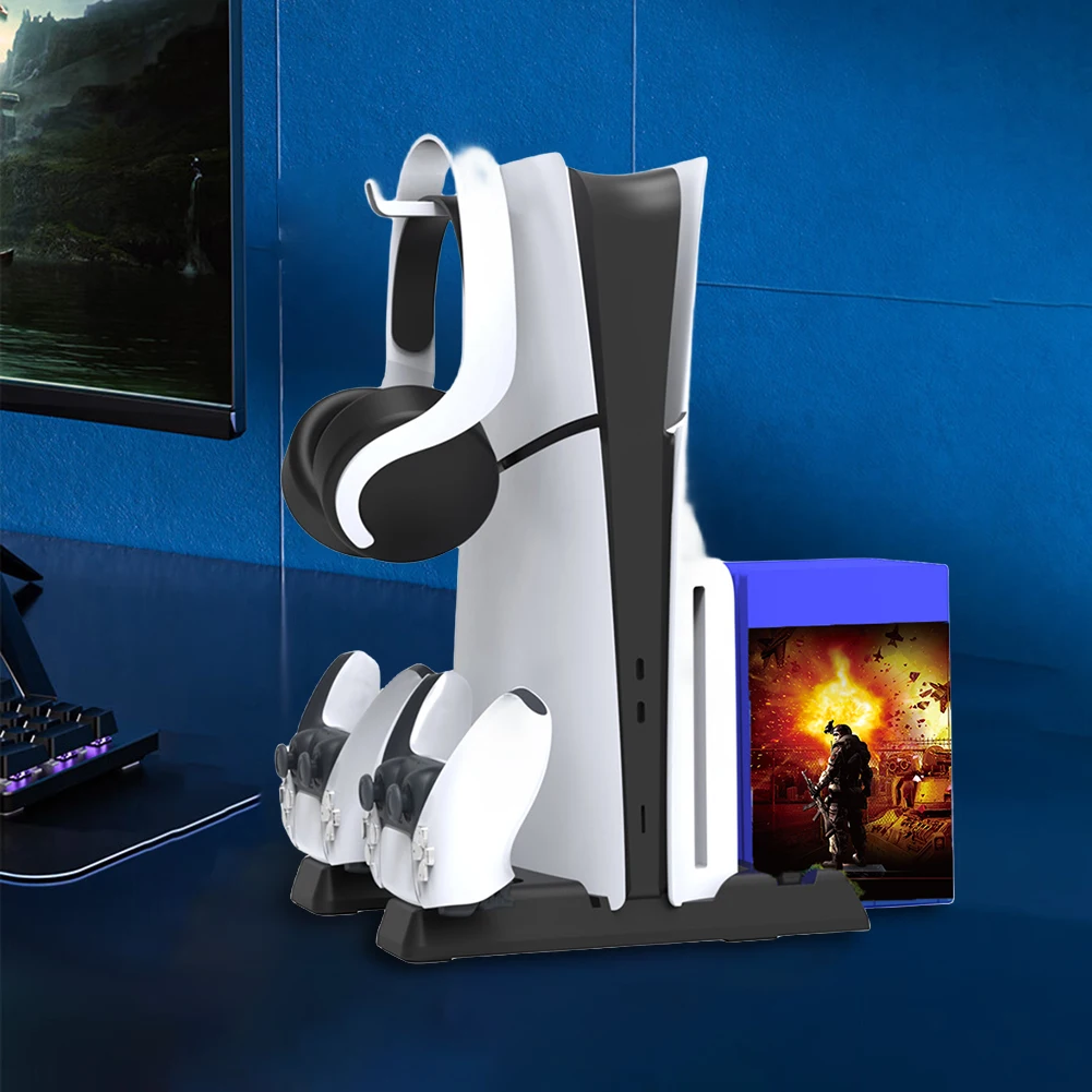 Estación de enfriamiento Estación de carga de controlador dual 11 Ranuras para juegos 2 Base de carga de controlador 1 Soporte para auriculares 2 Puertos USB3.0 para PS5 Slim/PS5 Consola Digital y edición de disco