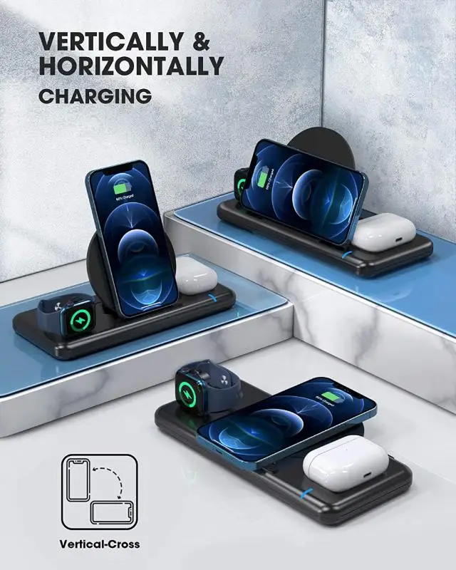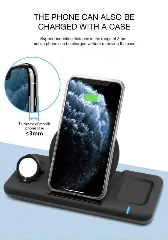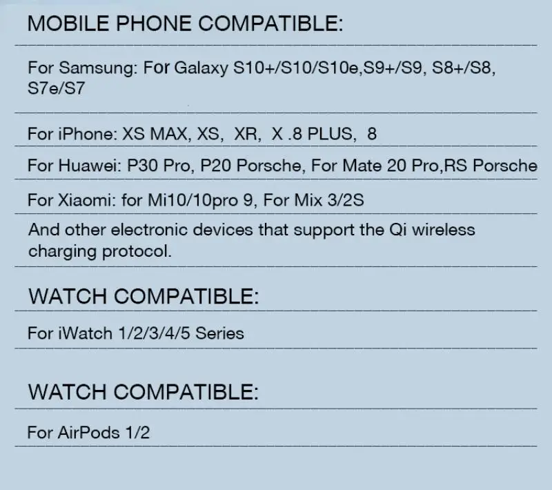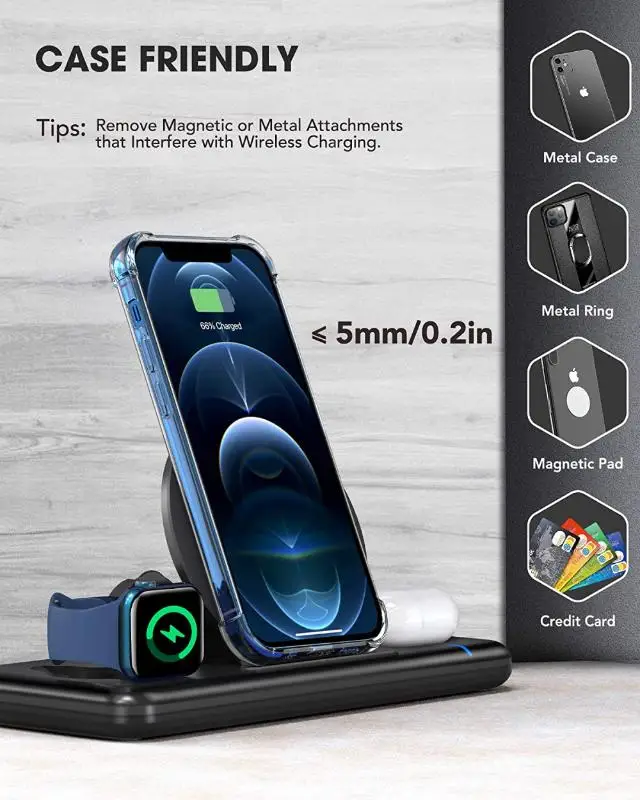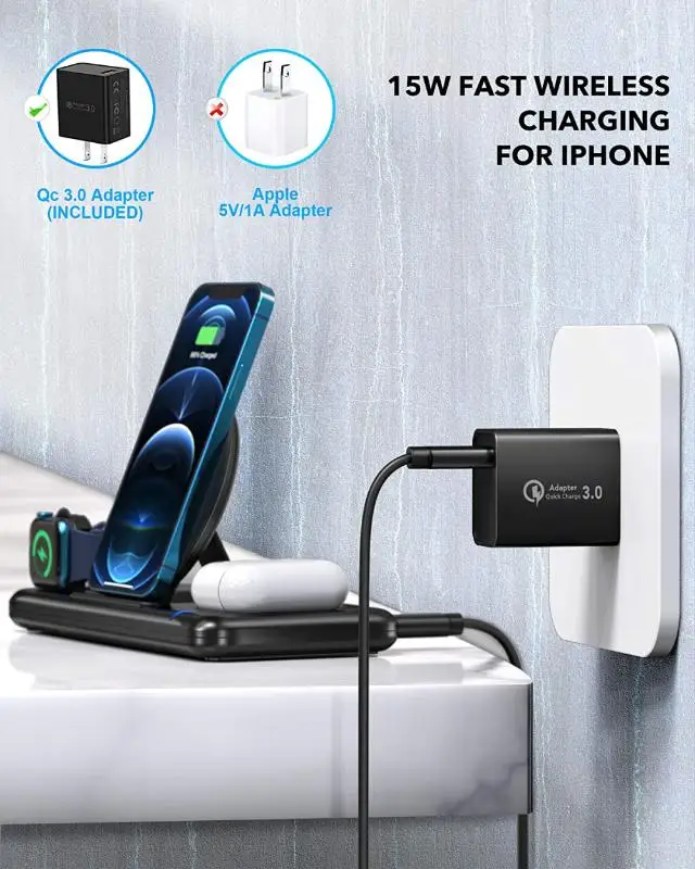 [Para la mejor experiencia de carga] 1. El iWatch 1 y los AirPods 1 no admiten carga inalámbrica. 2. 3. Requiere cargador magnético de Apple Watch (no incluido), 7. La carga rápida de 5W requiere adaptadores QC 3,0 (no incluidos), 4. La luz roja se utiliza para el modo de espera, el modo de carga del teléfono móvil es la luz azul).