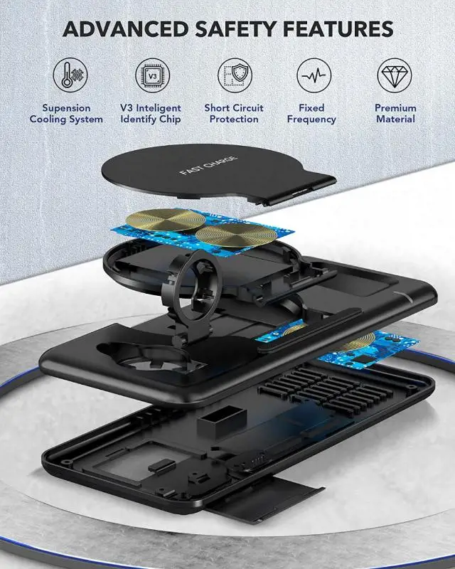 [Carga certificada Qi] le proporciona una variedad de protecciones, como protección contra sobretensión, protección contra cortocircuitos, control de temperatura, etc. No es necesario quitar la funda del teléfono al cargar, coloque el teléfono en este cargador inalámbrico para comenzar a cargar. Proporciona un cable de datos para que la carga sea más rápida y estable. El radiador de la estación de carga incorporada tiene una mayor disipación del calor.