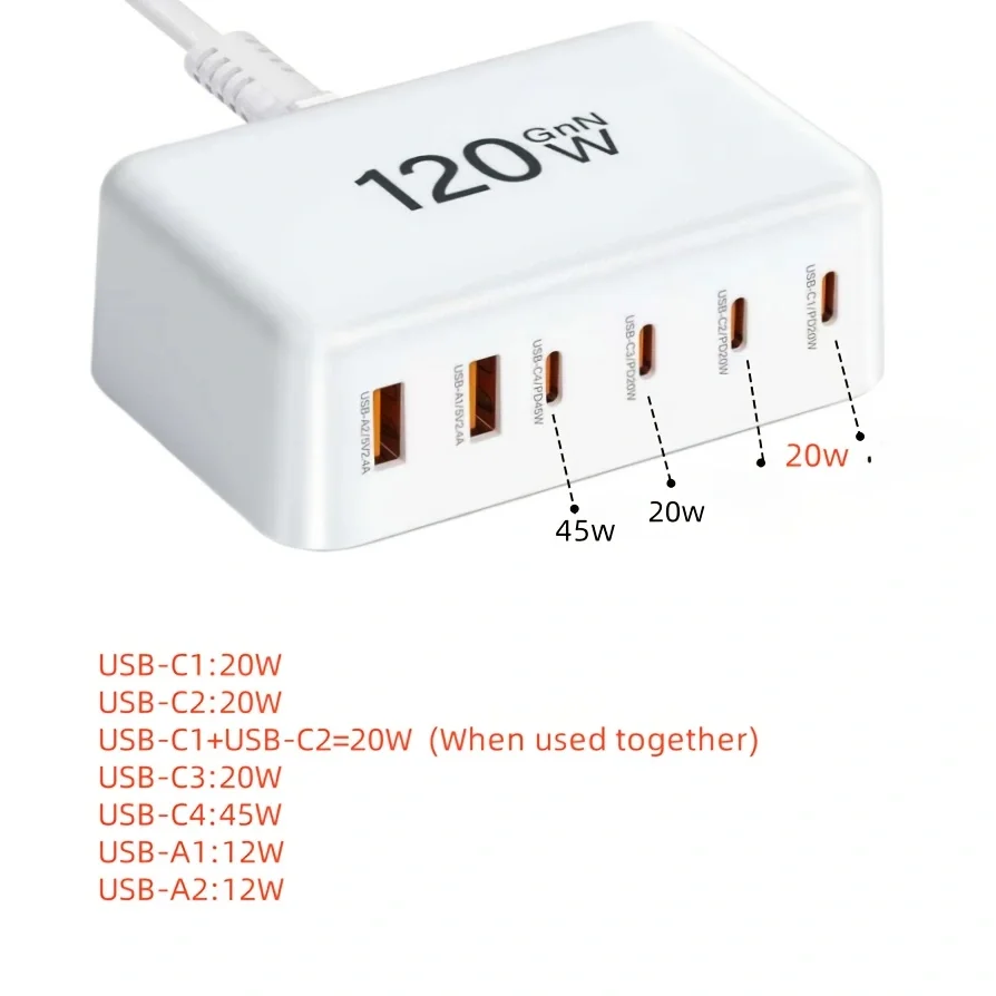 Cargador GaN de 120W, cargador USB tipo C PD de 6 puertos, carga rápida, cargador rápido USB3.0 tipo C, cargador USB para teléfono móvil