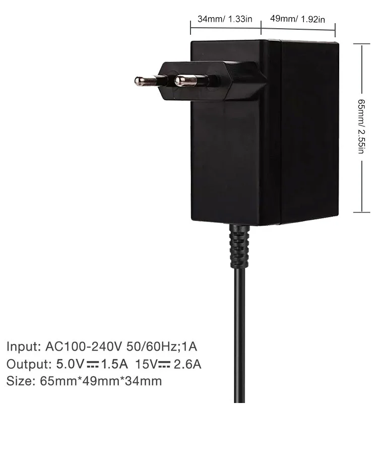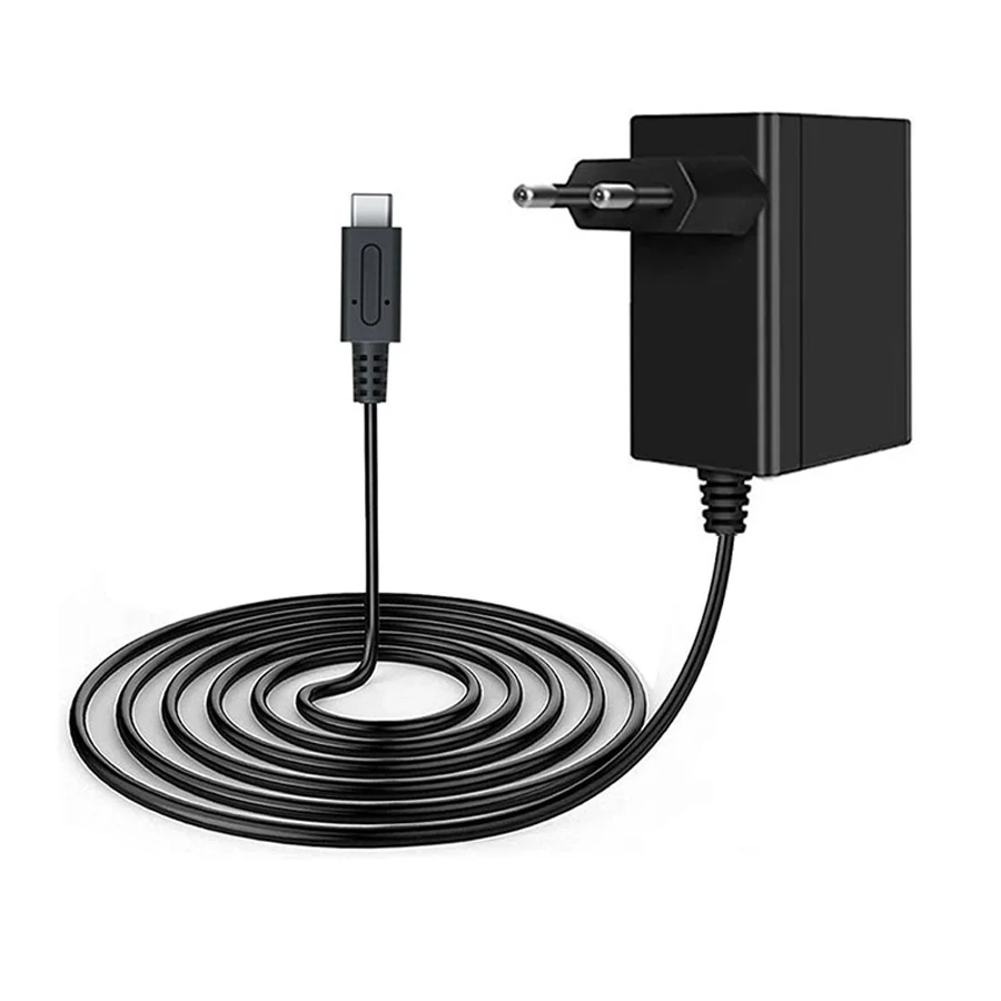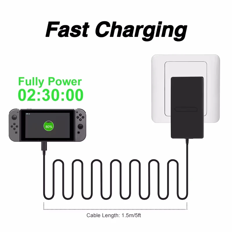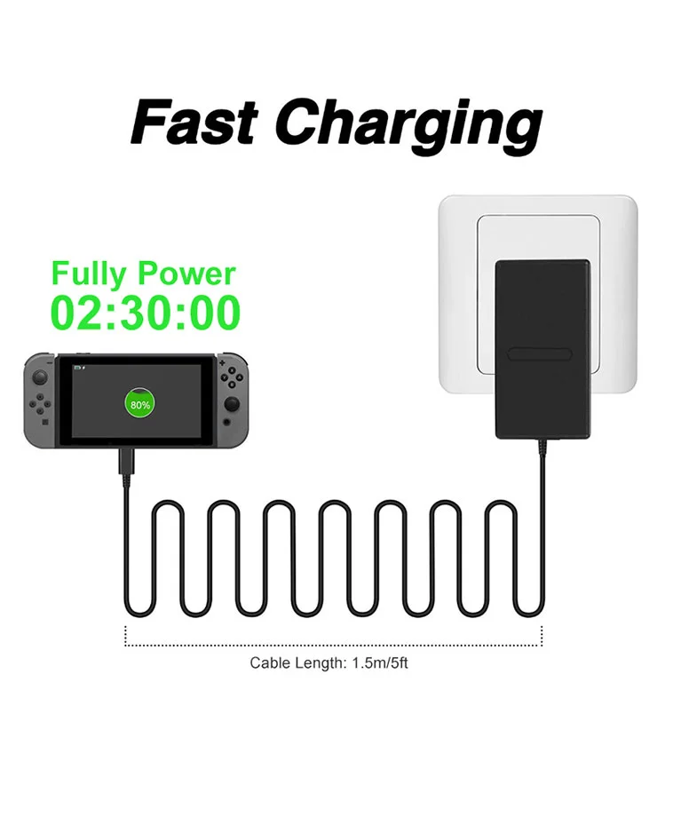 Cable integrado USB-C ultralargo de 5 pies (aproximadamente 1,5 metros), la salida de 15 V-2,6 A proporciona suficiente energía, cuando se usa la base en modo TV, es una excelente alternativa o adaptador de CA de repuesto para Nintendo Switch.