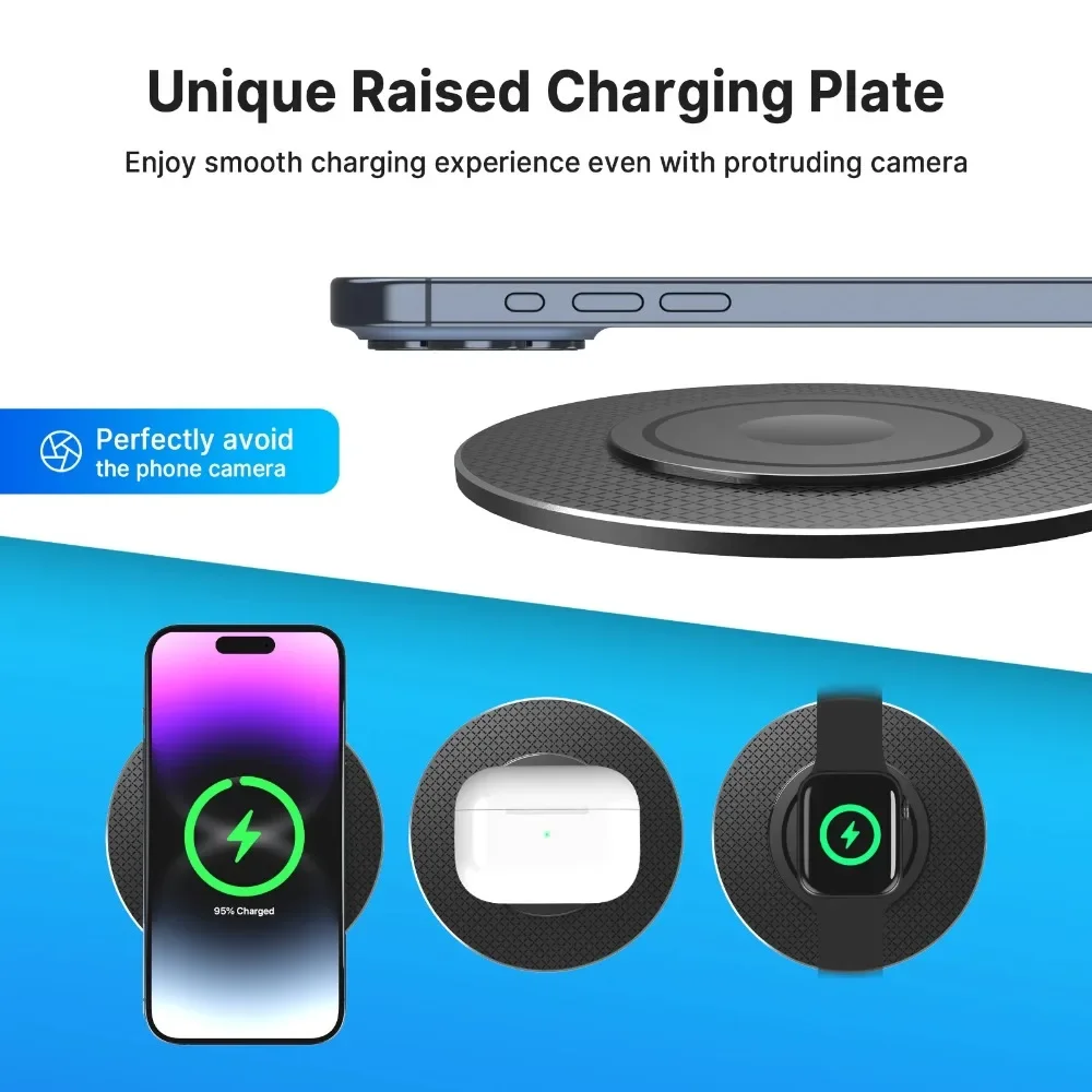 Compatibilidad universal:para iPhone 17 16 15 14 13 12 Plus /Pro/ Pro max (Nota: la función de succión magnética no es compatible con iPhone 11 a 8 series), también es compatible con Apple Watch Ultra 10 9 7 6 5 3 2 y AirPods (Nota : solo admite AirPods 2/3/4 con dispositivos magnéticos)