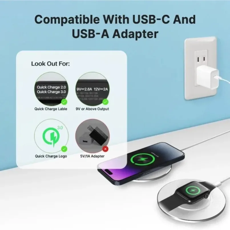 Aviso:1.El cargador de reloj solo para Apple Watch, no se puede cargar para Samsung Watch/otro reloj.2.Para garantizar una carga rápida, utilice el adaptador de corriente QC3.0 para cargar.3.Nuestros cargadores inalámbricos serán compatibles con todos los teléfonos que admiten carga inalámbrica. Entonces, si sus teléfonos admiten carga inalámbrica, ¡cómprelo!