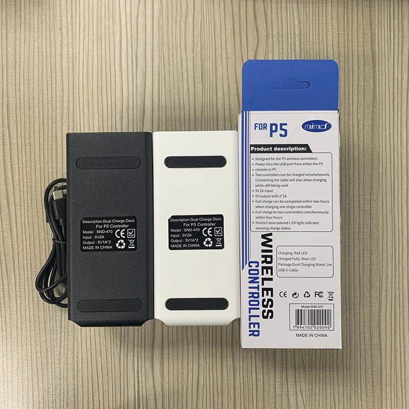 · Cargador de muelle diseñado para el controlador inalámbrico PS5 · Se pueden cargar dos controladores al mismo tiempo. El cable de conexión también se puede cargar mientras está en uso · Entrada 5V2A · Salida 5V2 * 1A · Al cargar un controlador, se puede cargar completamente en dos horas · Carga dos controladores al mismo tiempo y se carga completamente en cuatro horas. · El indicador LED único de dos colores muestra el estado de carga, la luz roja se muestra durante la carga, la luz azul se muestra cuando está llena