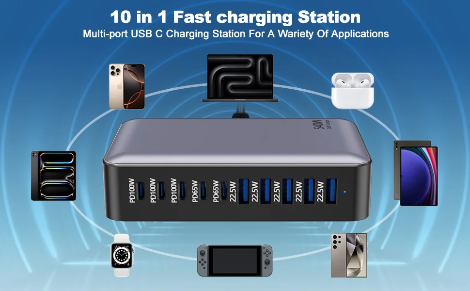 【Compatibilidad versátil de la estación de carga USB】 Con 5 puertos USB-C y 5 puertos USB-A, se adapta a una amplia gama de dispositivos de varias marcas como Apple, Samsung, Google, Dell y más.Suministro de energía USB-C de 100 W x 3 USB C y 3 x 65 W Compatible con teléfonos inteligentes, tabletas, computadoras y computadoras portátiles, cargador PD Compatible con MacBook Pro 13 ''/ MacBook Pro MacBook Air MacBook iPhone 16/16Pro/ 15 Pro max 14/14PLUS/14PRO/14PRO MAX 13/ 13 Mini/ 13 Pro/ 13 Pro Max iPhone 12/ 12 Pro/ 12 Pro Max/ Samsung Galaxy/ Dell XPS 15/ 13 Google Pixel iPad Series/ iPad Air Series AirPods Pro.más hasta 3× más rápido que con un cargador antiguo original.5 puertos de carga rápida USB de 22,5 W para sus otros dispositivos