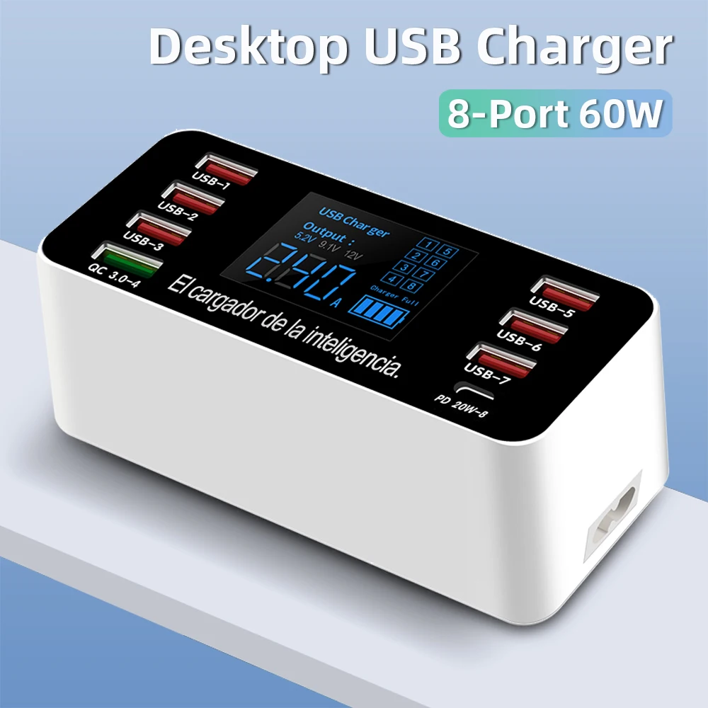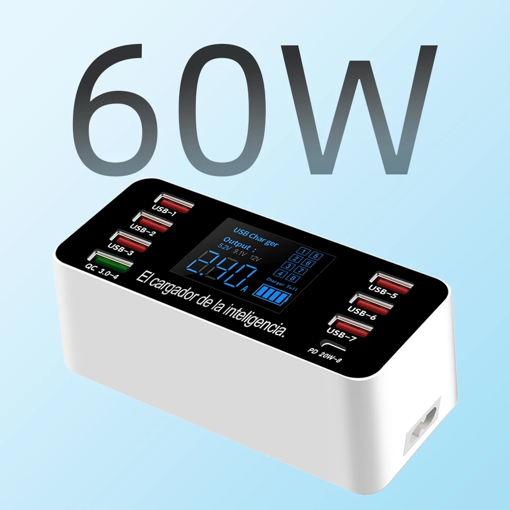 Comprar Estación de carga rápida USB, cargador de 60W, QC 3,0, PD, USB C, teléfono, tableta, Cargador rápido para iPhone, xiaomi, huawei, samsung