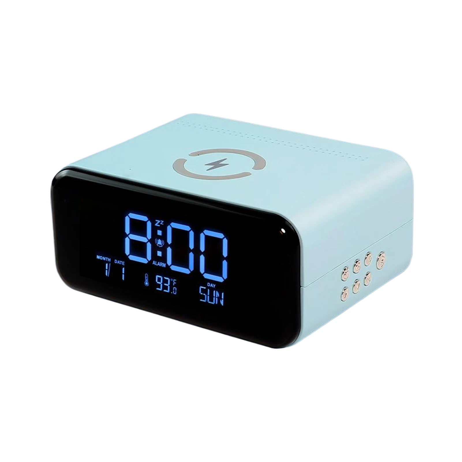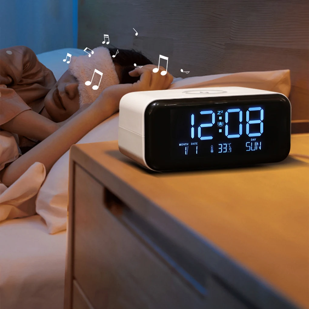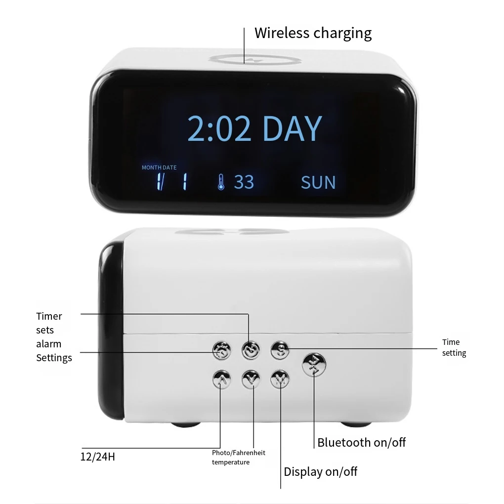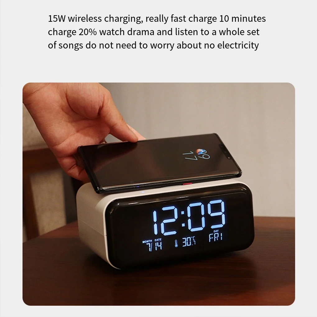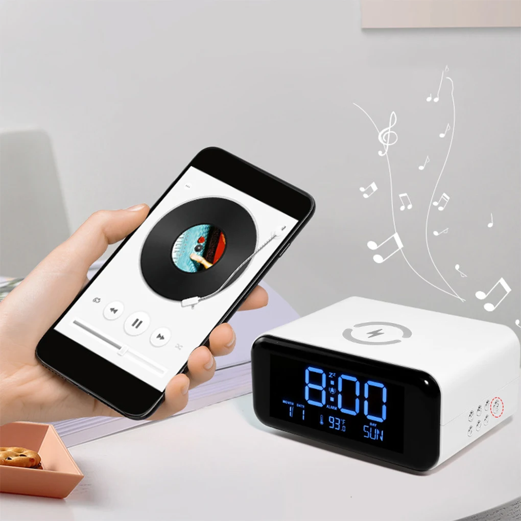 Cargador inalámbrico Altavoz Bluetooth Despertador: Manténgase organizado con este dispositivo todo en uno que presenta hora, semana, calendario y temperatura en la misma pantalla