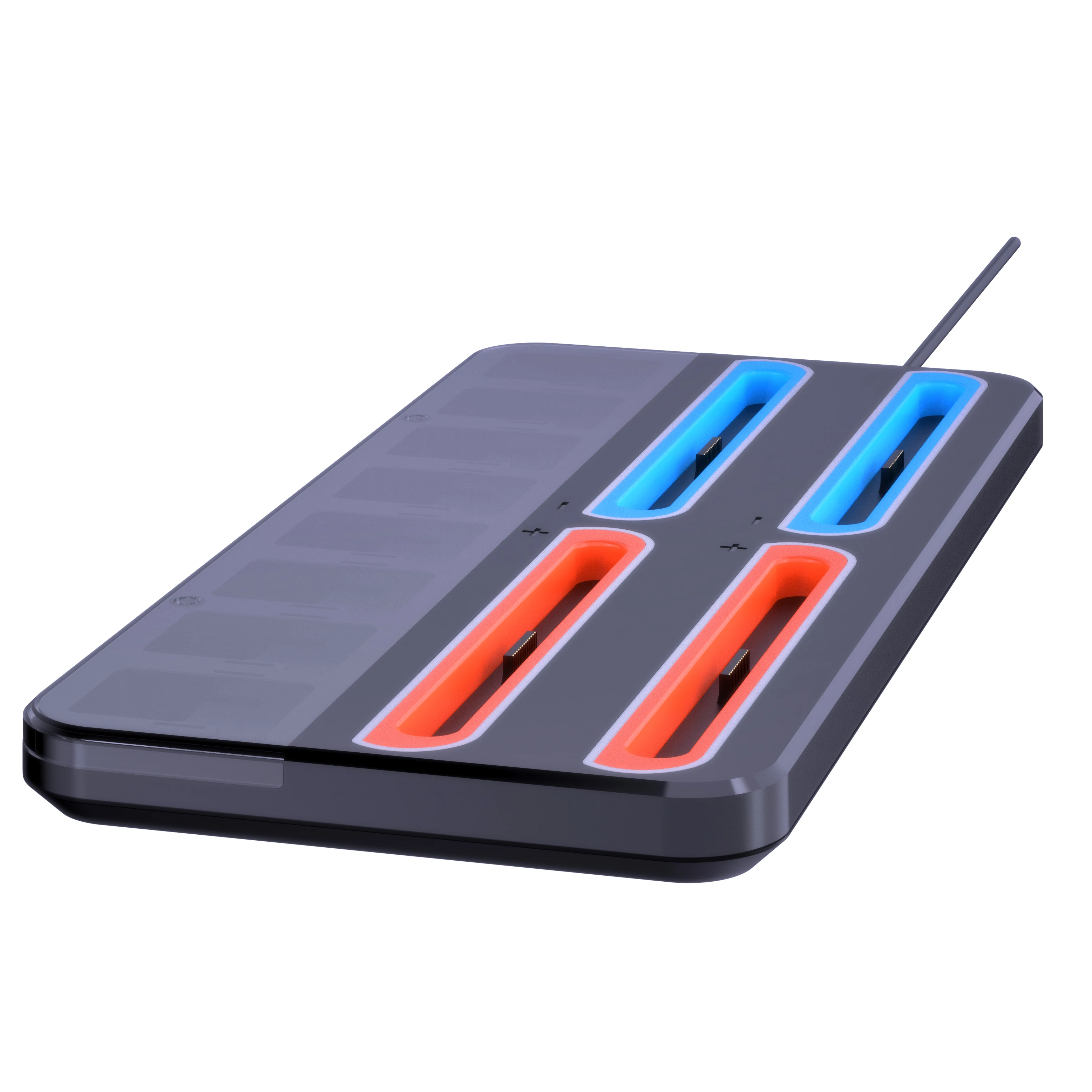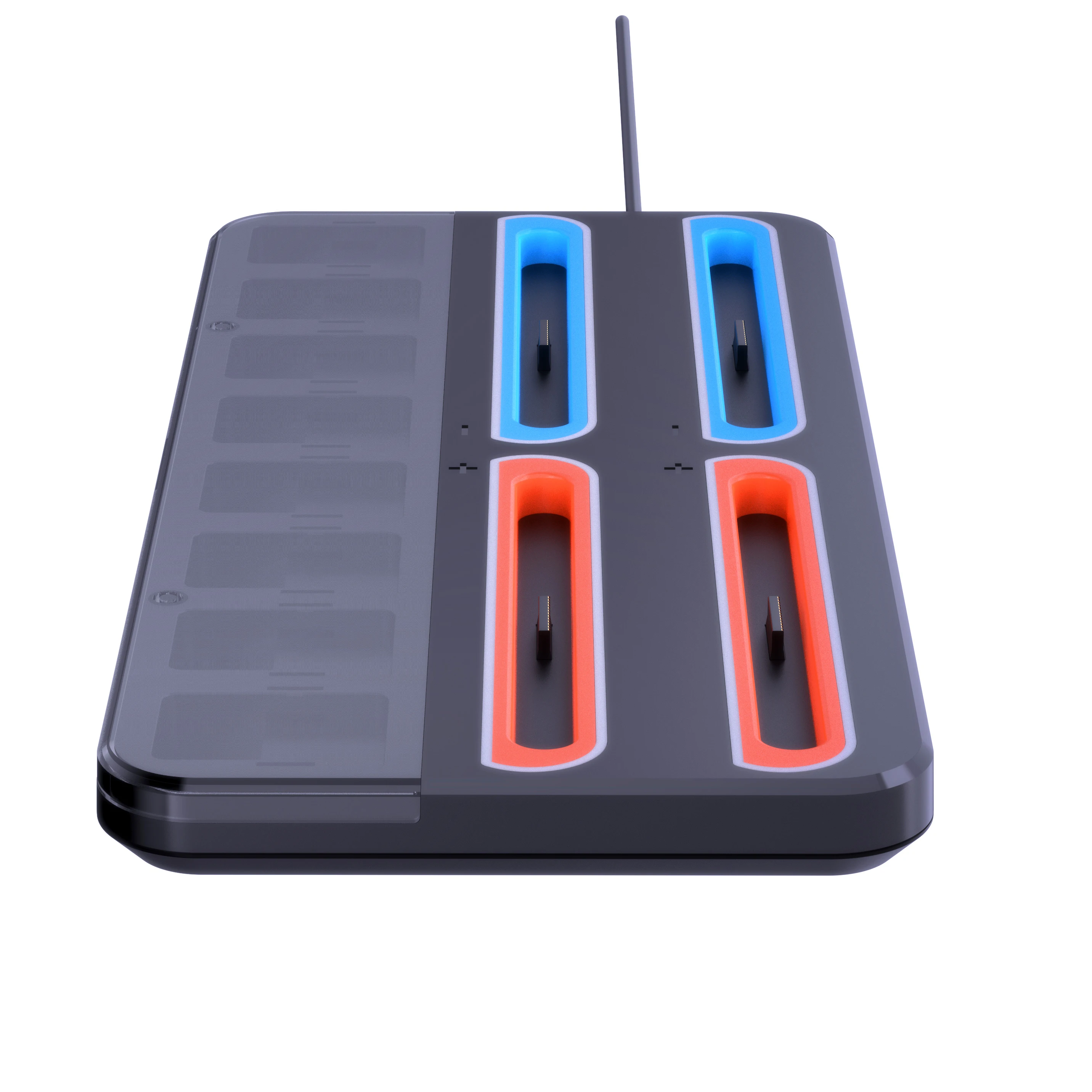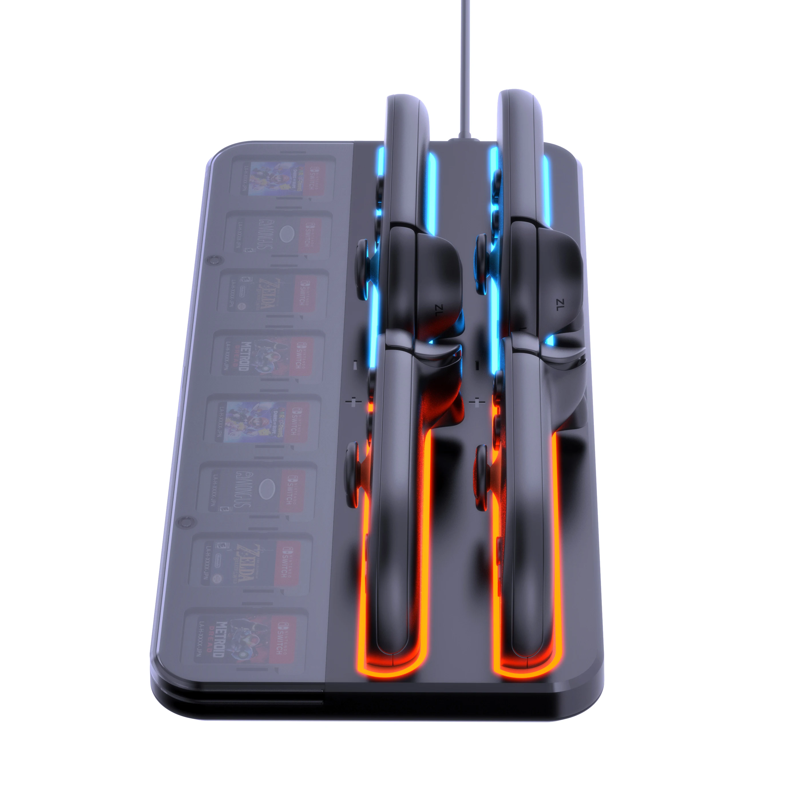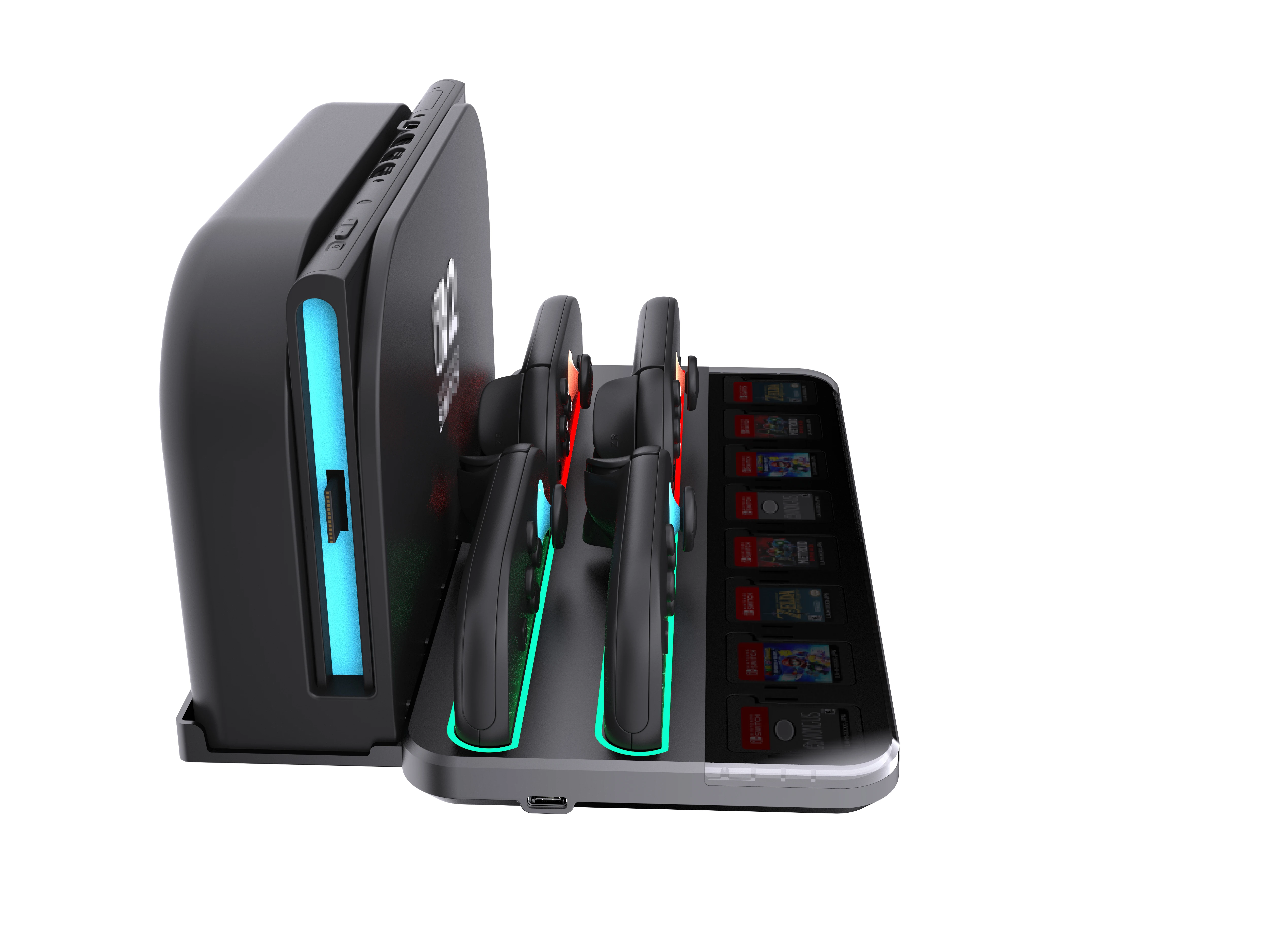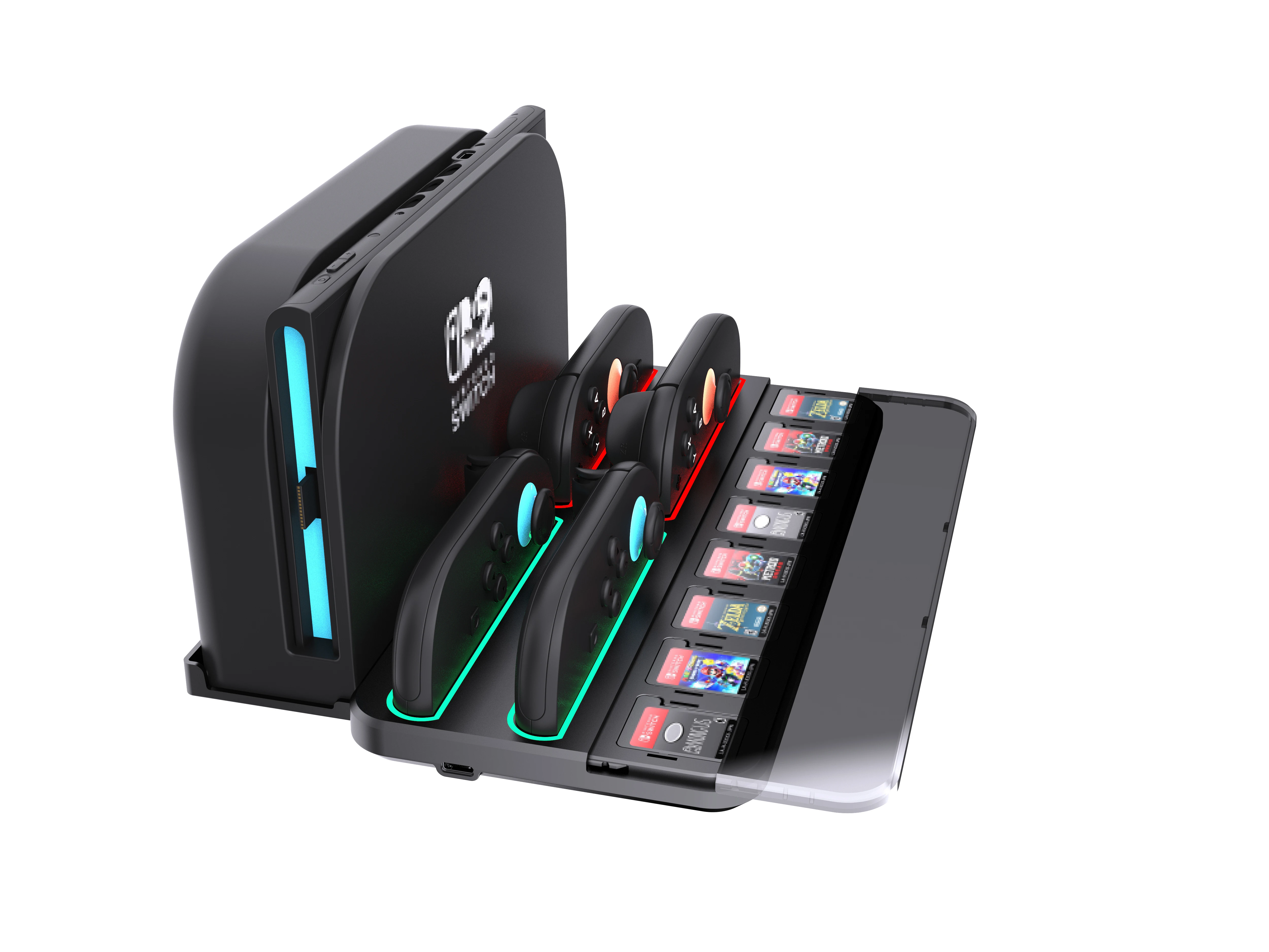 RGEEK Estación de carga multifunción NS2 para Switch 2 con 4 puertos de carga, almacenamiento de 8 ranuras para tarjetas e indicadores LEDCaracterística:1.Indicadores de carga eficientes: la estación de carga cuenta con un sistema de indicadores con luces naranjas y verdes para mostrar el estado de carga de hasta un controlador, que ofrece siete modos de luz RGB, como parpadeo lento, parpadeo rápido y colores constantes para una apariencia personalizable.2.Fácil inserción del controlador: simplemente deslice sus controladores en las ranuras de la estación de acoplamiento y deje que las luces LED claras indiquen una inserción o finalización exitosa de la carga.Una base de carga imprescindible para los entusiastas que buscan un almacenamiento conveniente.3. Adaptación de diseño único: esta estación de soporte de carga se adapta perfectamente a su base, con ventilación optimizada para garantizar una circulación de aire eficiente, evitando el sobrecalentamiento durante sesiones de juego prolongadas.4.Solución de almacenamiento integral: tiene capacidad para hasta cuatro controladores y 8 tarjetas de juego junto con su consola.Ligera y portátil, esta estación de carga proporciona una solución de almacenamiento centralizada y de fácil acceso. El paquete incluye: 1 * Base de carga para Switch 2
