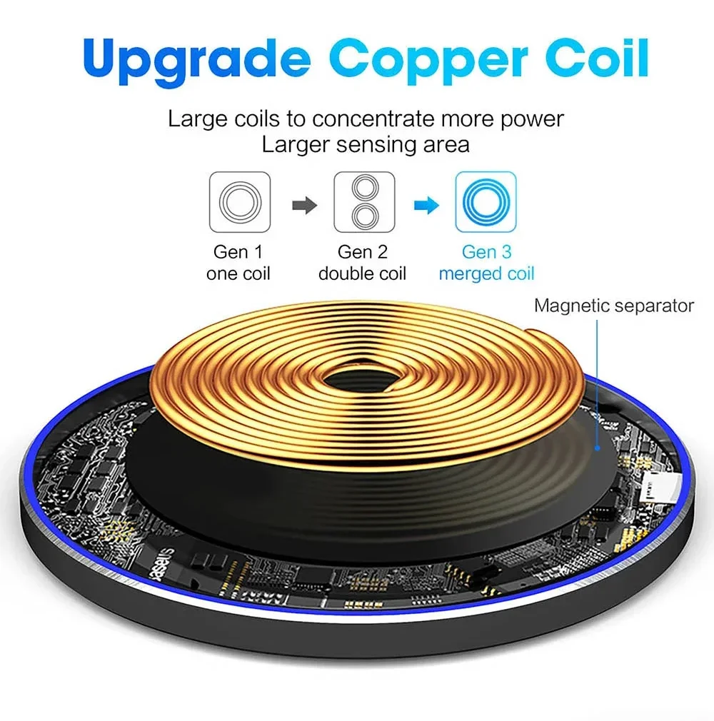【Más seguro y fácil de usar】La exclusiva tecnología multifuncional de protección inteligente proporciona control de temperatura, protección contra sobretensiones y prevención de cortocircuitos.Además de eso, estos cargadores inalámbricos están hechos de material ABS resistente al fuego, puede comprarlos con seguridad.La doble garantía y la doble seguridad le brindan una experiencia de seguridad.Para obtener una mejor experiencia, nos gustaría que quites la funda del teléfono y utilices los adaptadores recomendados (NO INCLUIDOS).