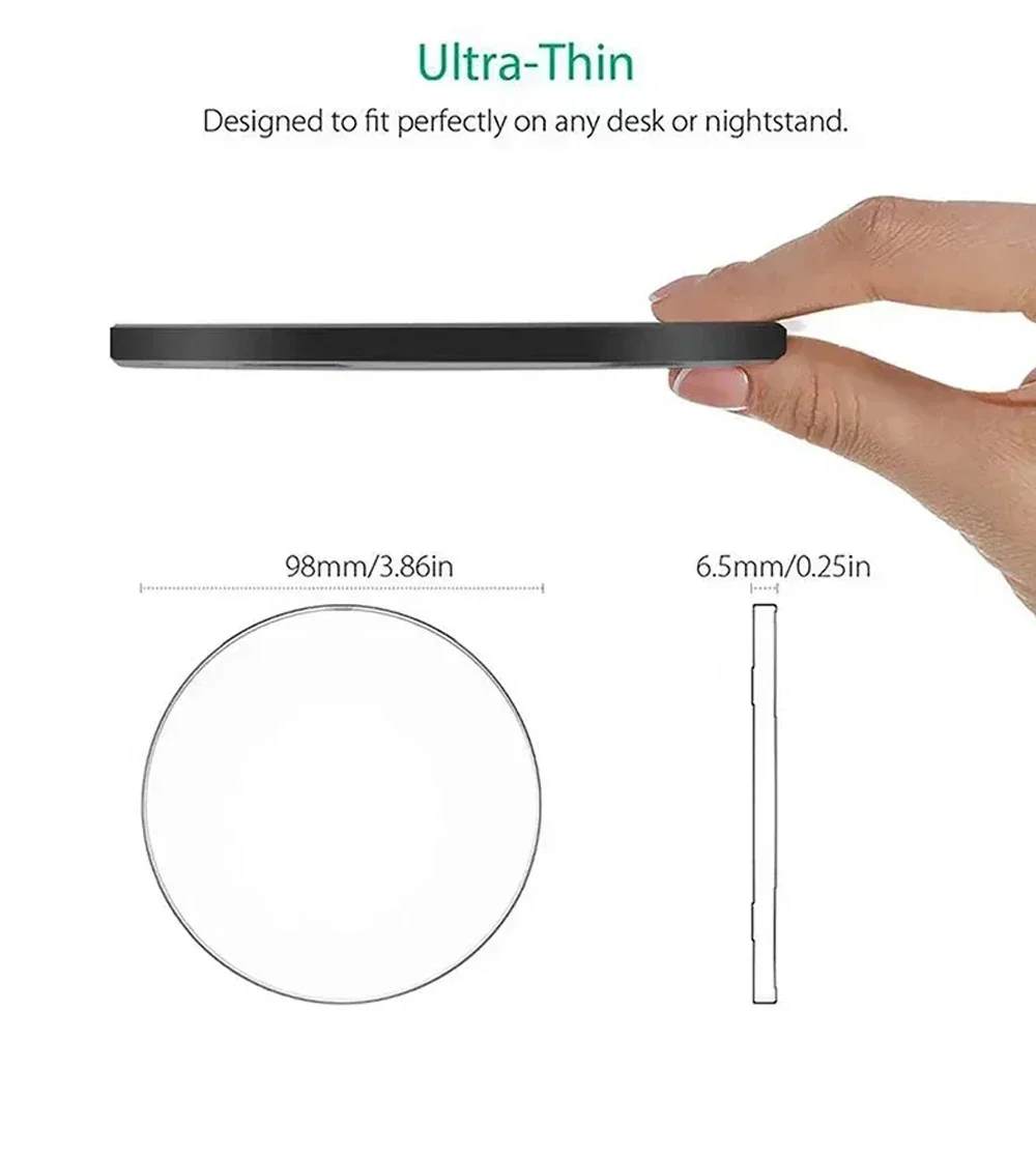 【Diseño delgado y genial】Diseño ligero, elegante y compacto con goma antideslizante.Esta plataforma de carga inalámbrica mide solo 6 mm/0.23 pulgadas súper delgado y ocupa muy poco espacio hacen que sea más fácil guardarlo en los bolsillos, una plataforma de carga inalámbrica de alta velocidad se puede transportar fácilmente durante viajes o negocios. Este cargador se siente sólido y se ve genial sin importar usarlo en la oficina en casa.