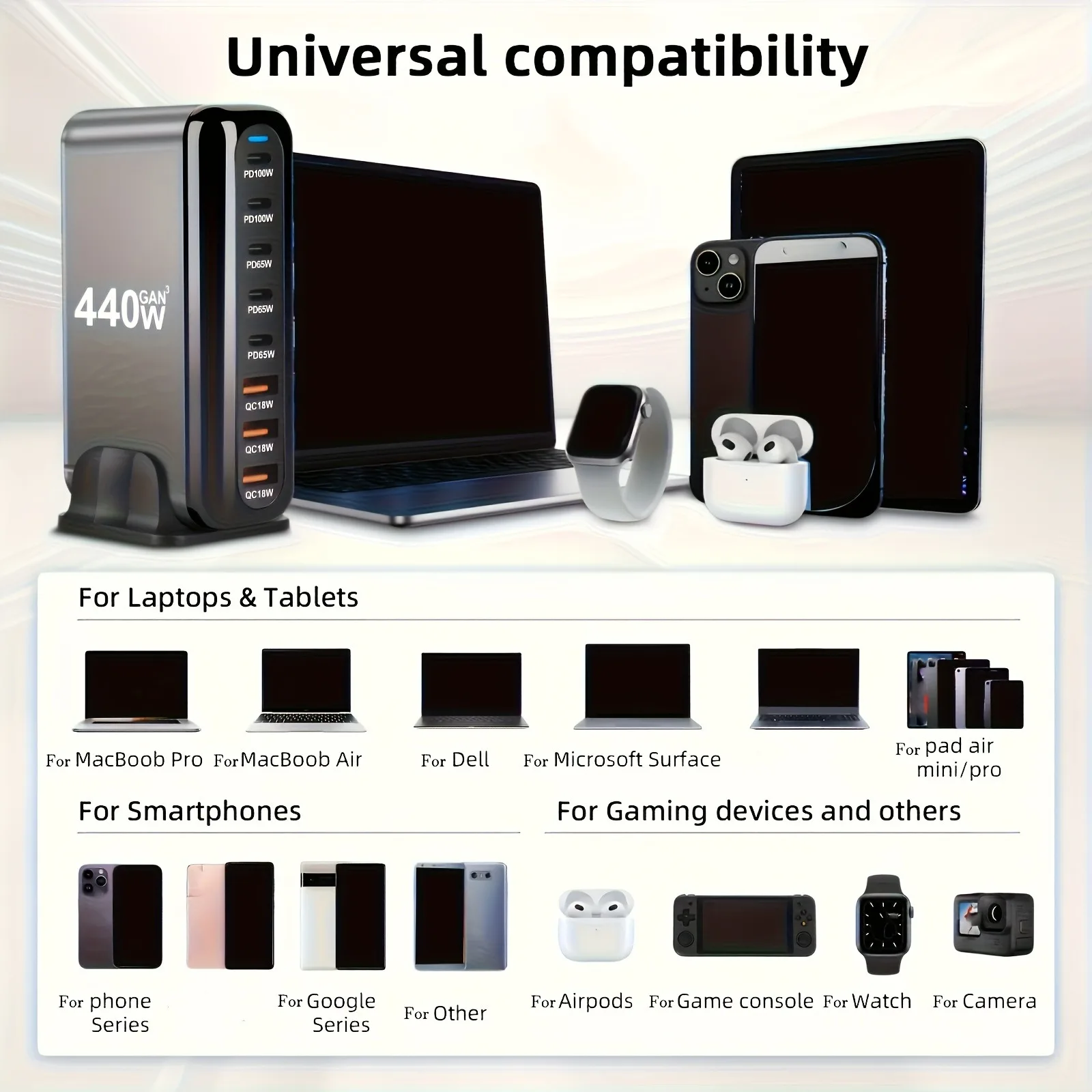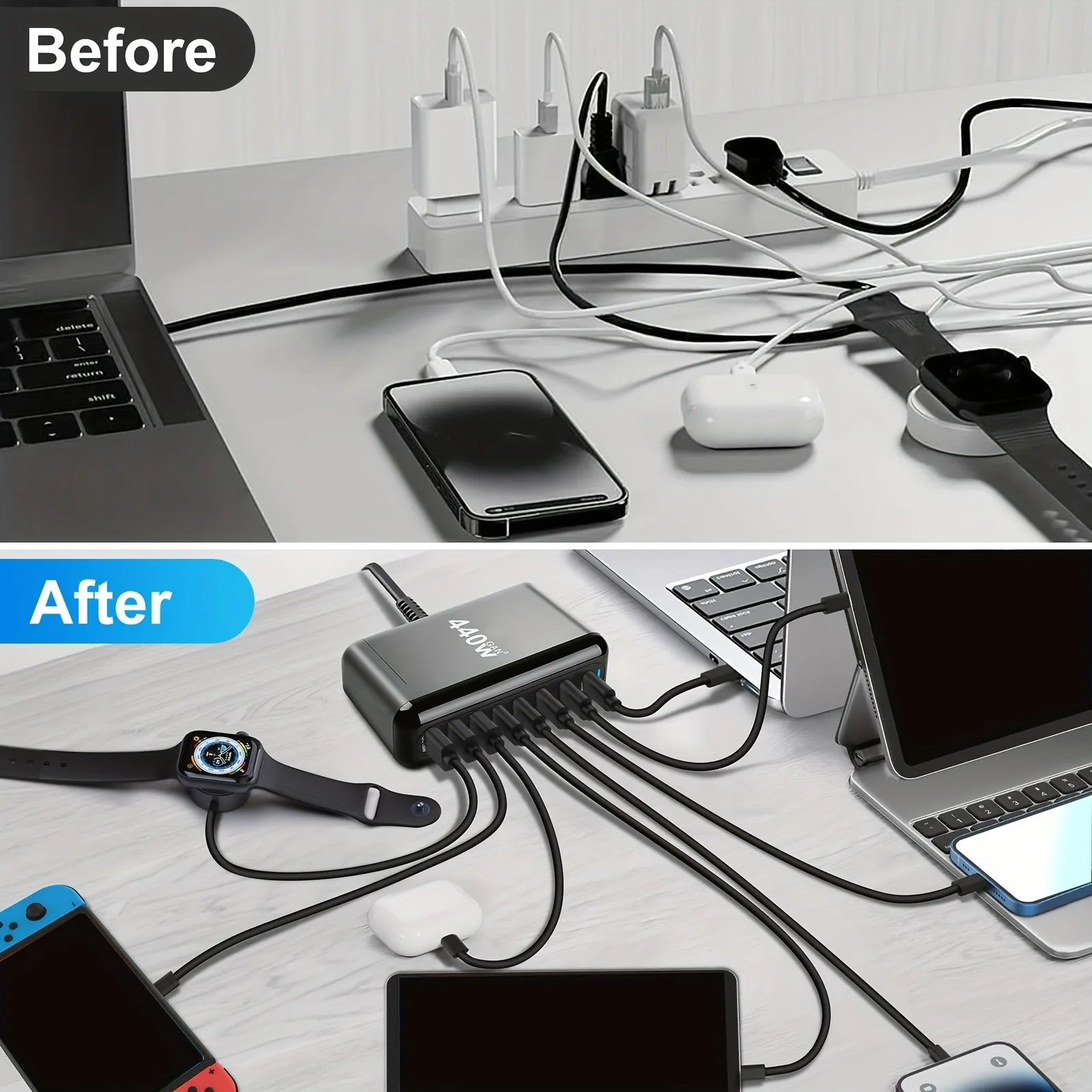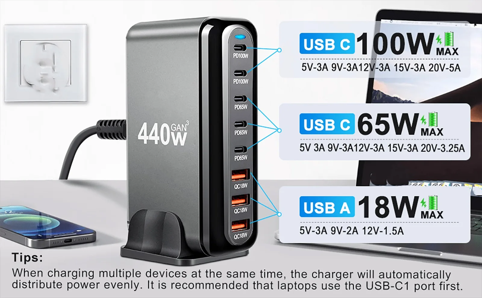 Cargador rápido multipuerto GaN de alta potencia de 440 W con enchufe estándar de EE. UU., KR, Reino Unido, AU/UE con 3 puertos USB y 5 puertos tipo c, múltiples puertos de carga, cargador rápido para teléfono celular con indicador de carga LED, estación de carga para iPhone, MacBook, para Samsung, etc.