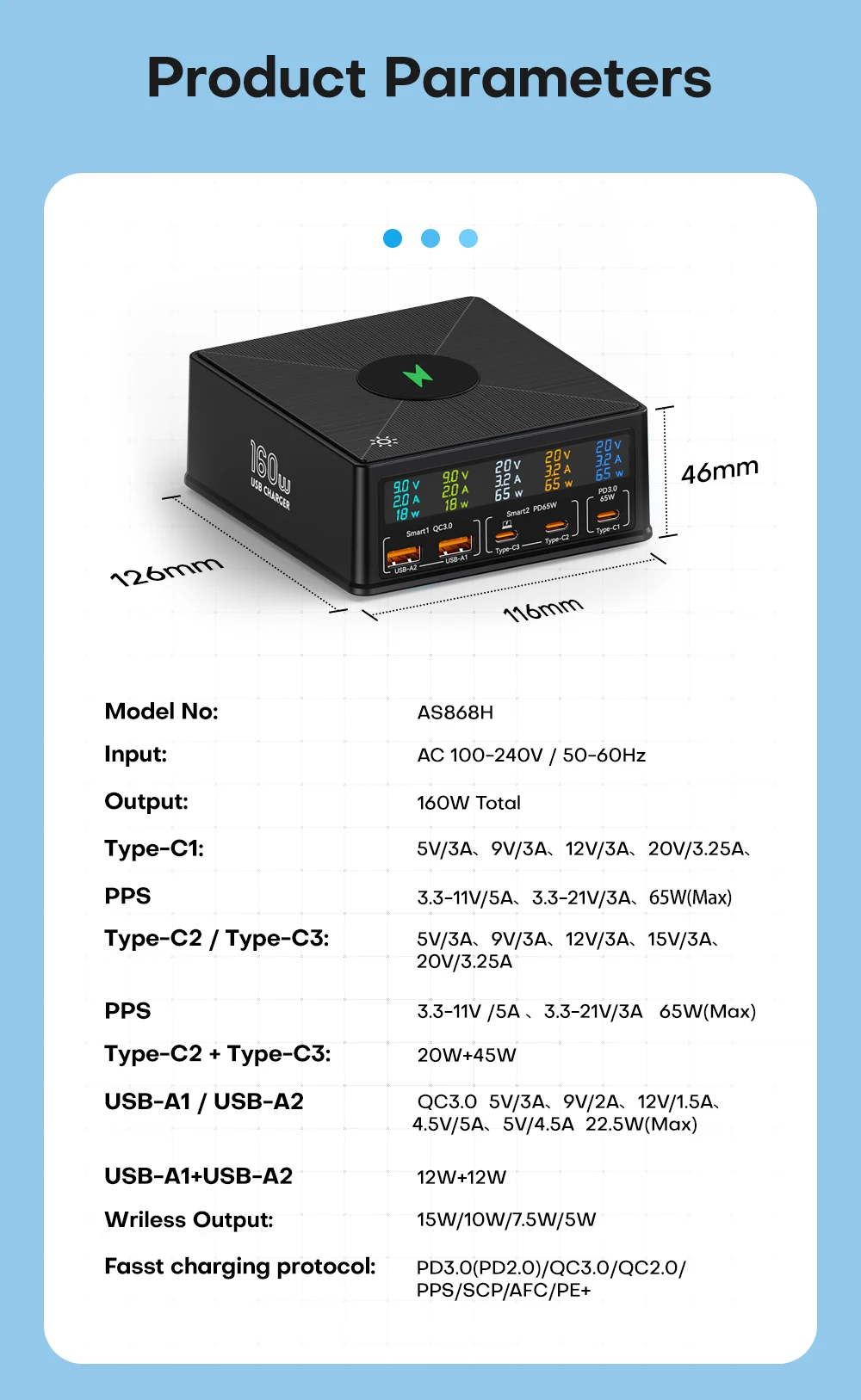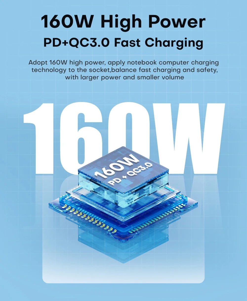 Adopta 160W de alta potencia, aplica tecnología de carga de ordenador portátil al enchufe, equilibra la carga rápida y la seguridad, con mayor potencia y menor volumen.