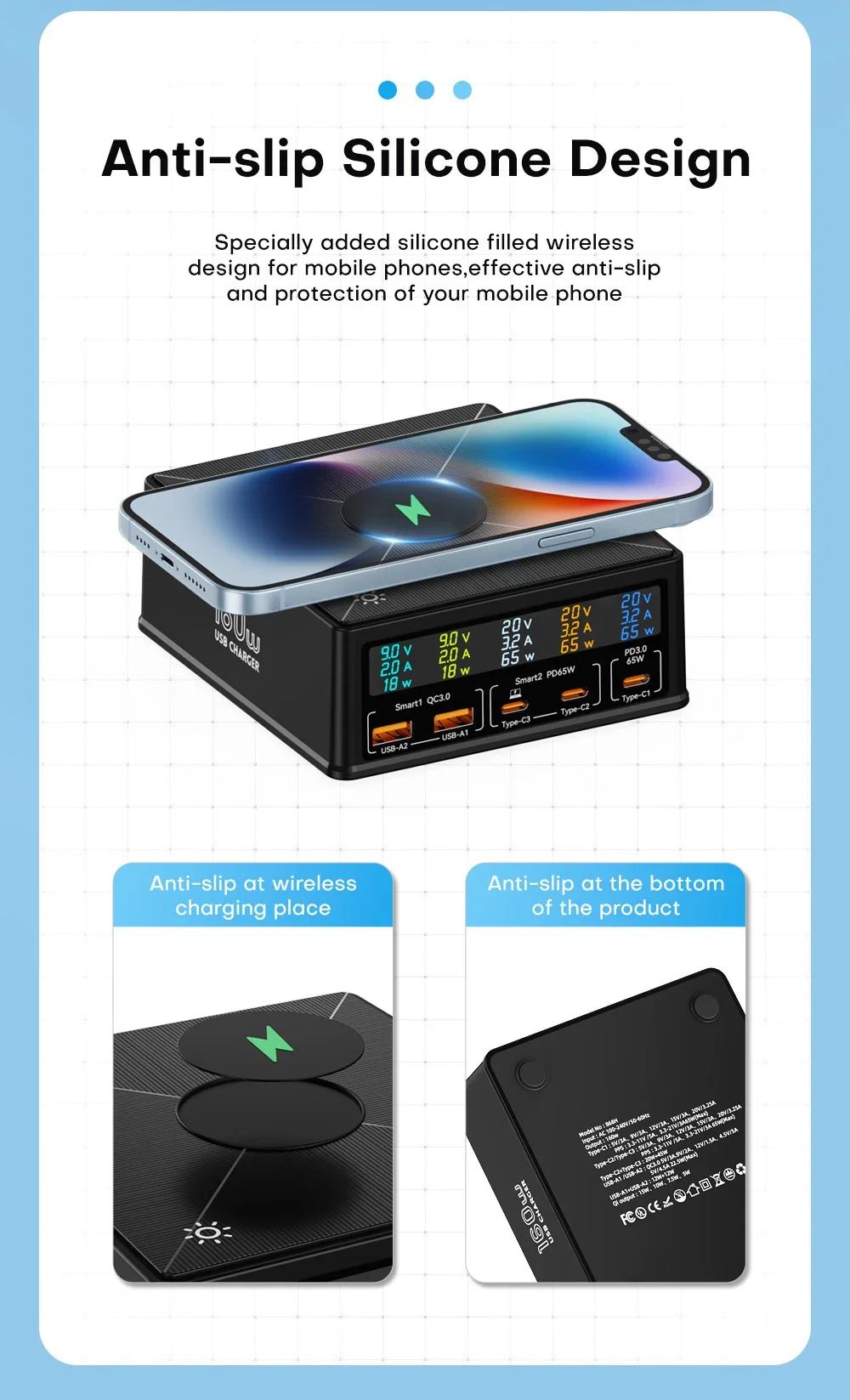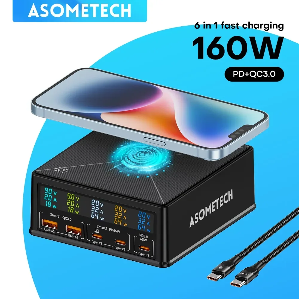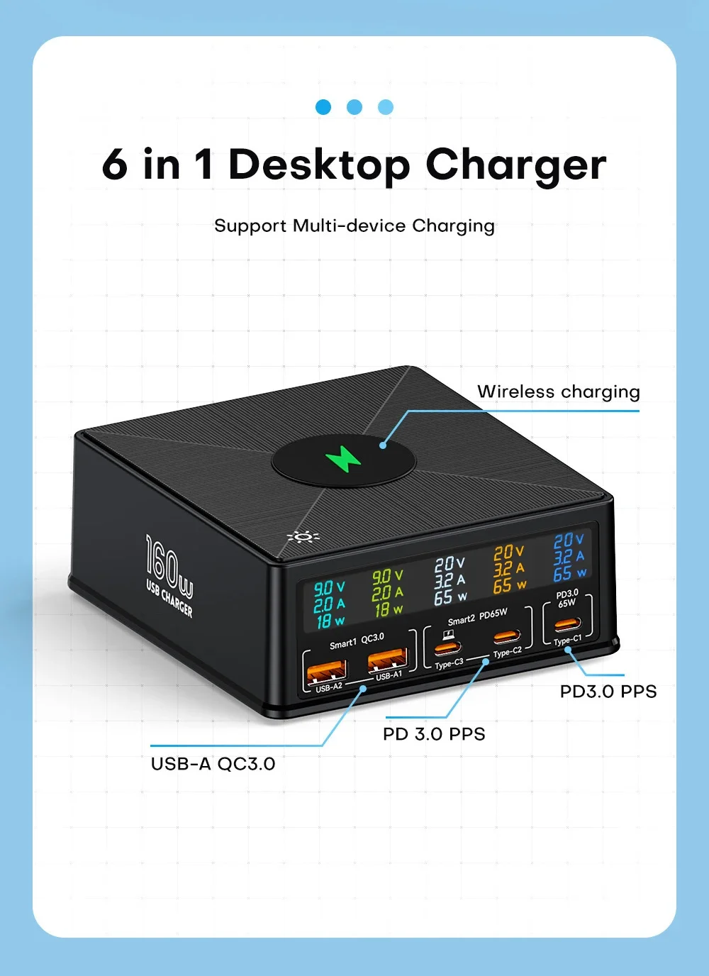 Comprar Estación de carga USB GaN de 160W, 15W, carga inalámbrica, pantalla LCD, USB C, PD, 65W, QC, Cargador rápido para Iphone 14, Samsung, Xiaomi, portátil