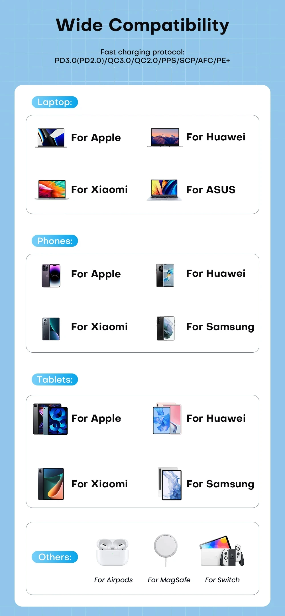 ⚡El Sistema de carga rápida QC3.0 FCP SCP tiene un protocolo de carga rápida para múltiples marcas de dispositivos, el tipo de dispositivo que se puede utilizar en el tipo de dispositivo.