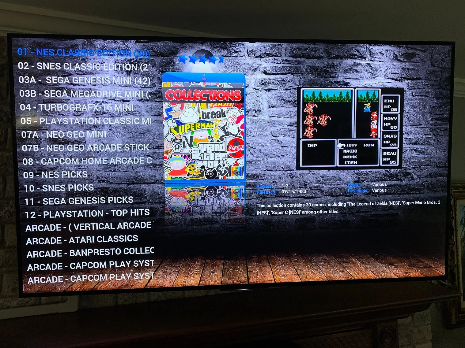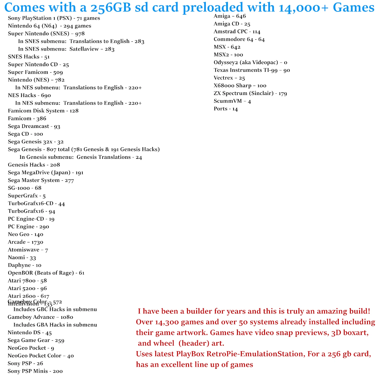 Los juegos tienen vistas de video a snap, boxart 3D y rueda (encuenta) art.Utiliza la última PlayBox RetroPie-EmulationStation, para una tarjeta de 256 gb, tiene una excelente línea de juegos;Obra de vista previa de vídeo premium para arcade y neogeo;listado más organizado de sistemas por fabricante, consolas domésticas, dispositivos portátiles, sistemas informáticos y colecciones;menús de selección de emulador habilitados en el arranque del juego, mejores temas precargados;