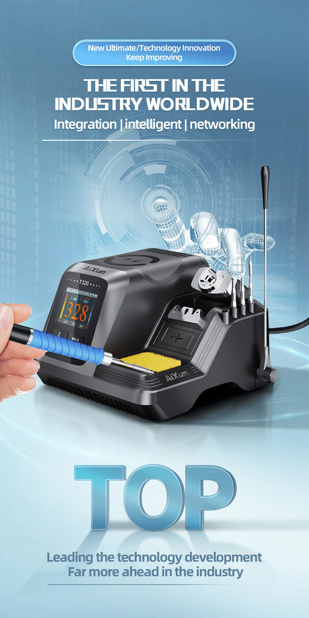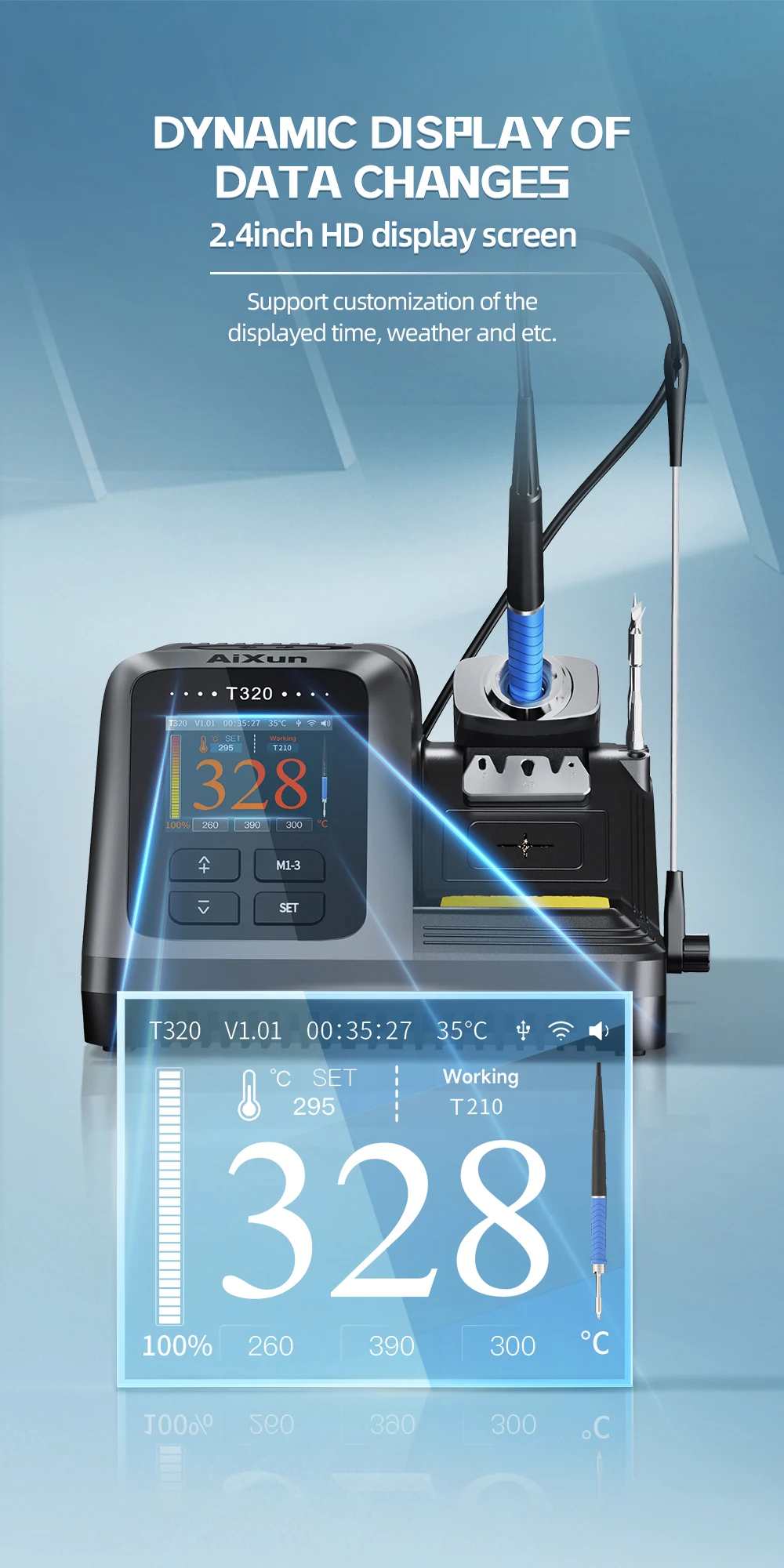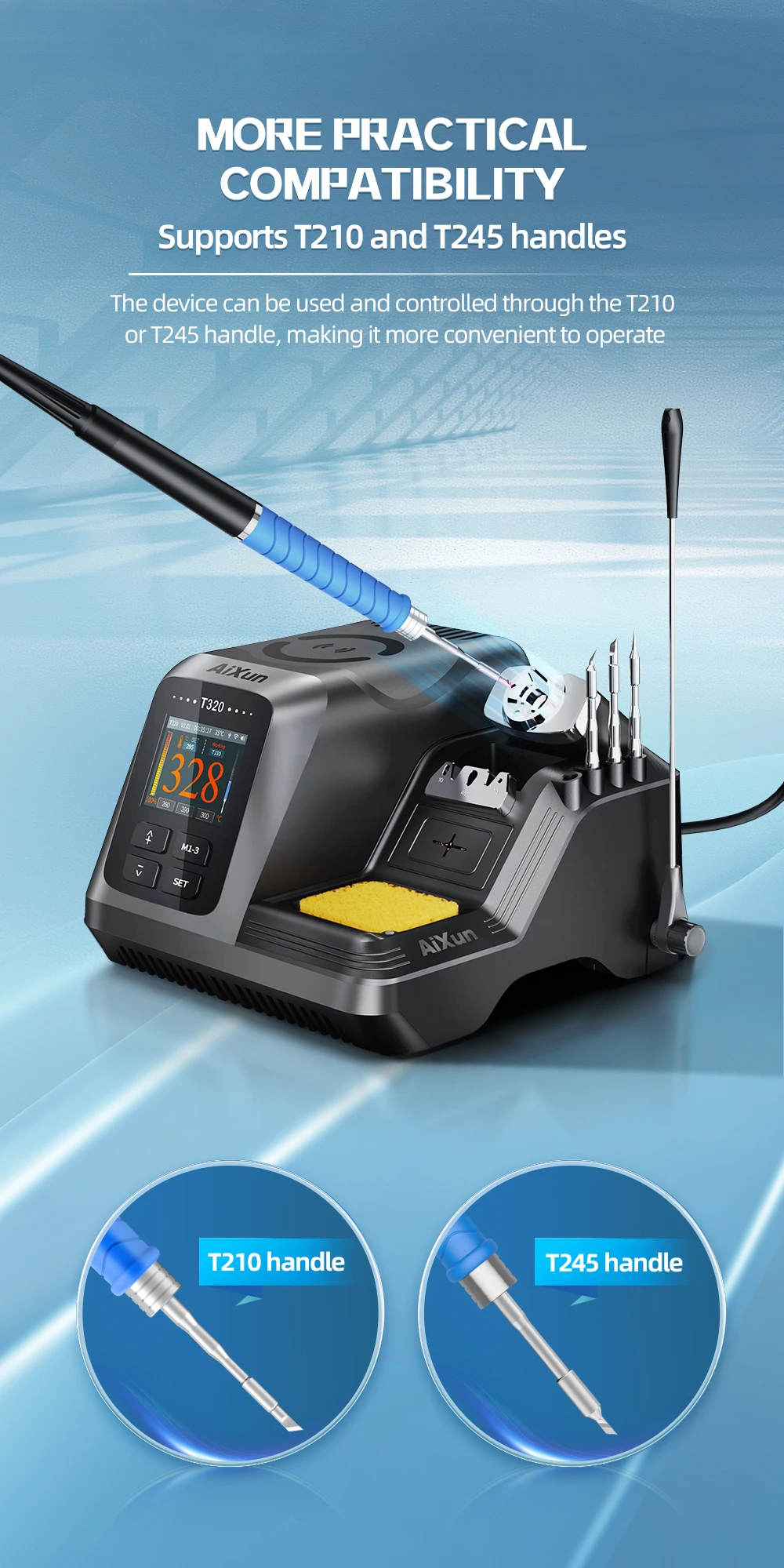 La estación de soldadura de precisión AiXun T320 es la primera herramienta de soldadura inteligente que combina las características de integración, inteligencia y red en todo el mundo. Admite manijas T210 y T245 con alta compatibilidad, conveniente para su uso; Entrada de voltaje de amplio rango de suministro de CA de 100-240 V, uso universal en todo el mundo, evita problemas de voltaje bajo o inestable; El sistema inteligente de asistencia de soldadura ayudará a controlar el estado de la punta de soldadura en tiempo real, la protección contra altas temperaturas, la protección contra cortocircuitos y las funciones de espera en tiempo real garantizan una vida útil más larga de la punta de soldadura; innovadora tecnología de control táctil de punta de soldadura, táctil y play, más conveniente que el control por cable; control PID inteligente, antiinterferencias, antiestático, pequeña fuga, buena estabilidad, potencia suficiente; También admite la personalización de la hora, el clima, etc. mostradas. ¡brindándole una experiencia más práctica y satisfactoria!
