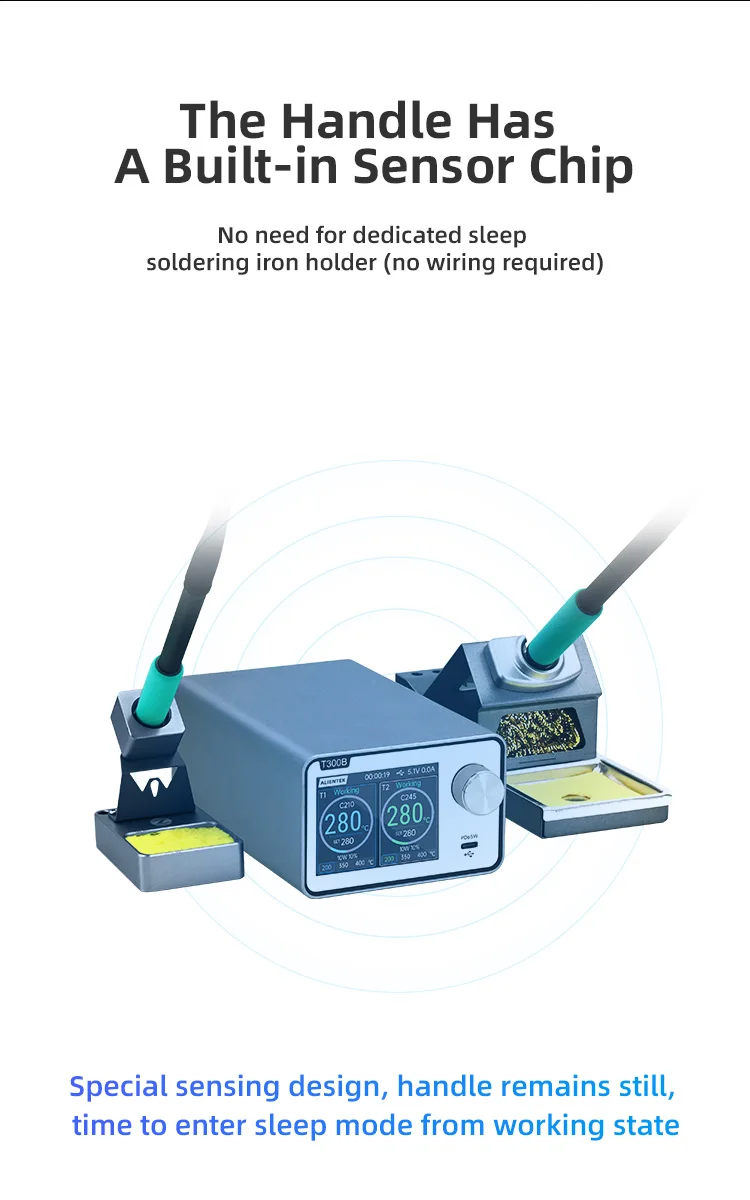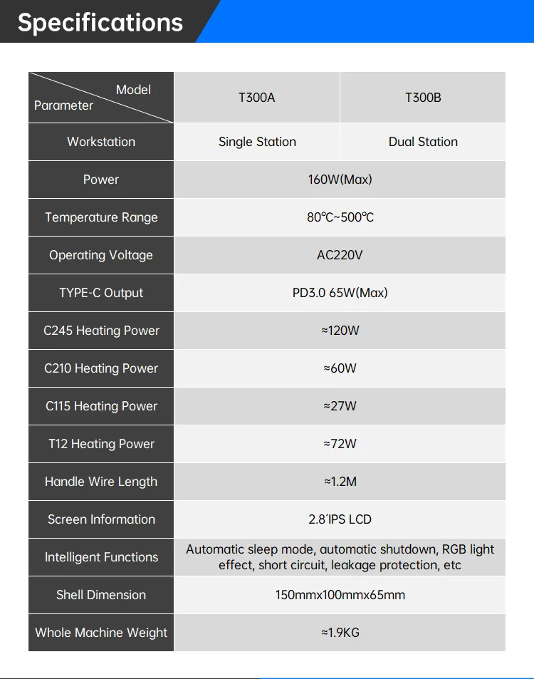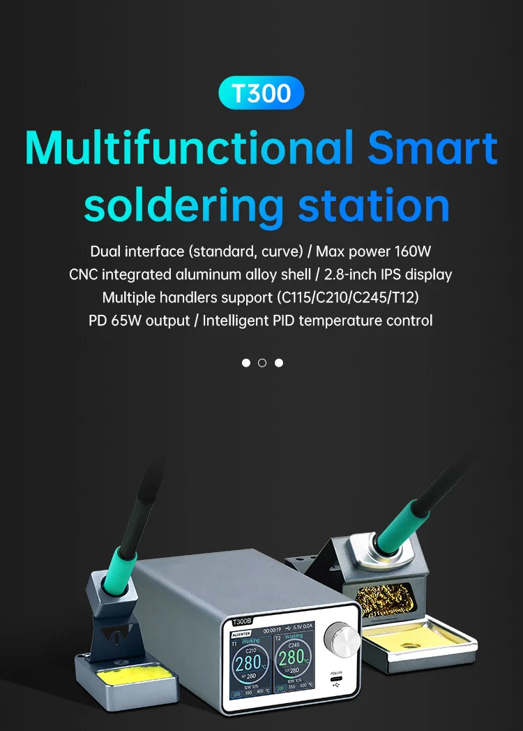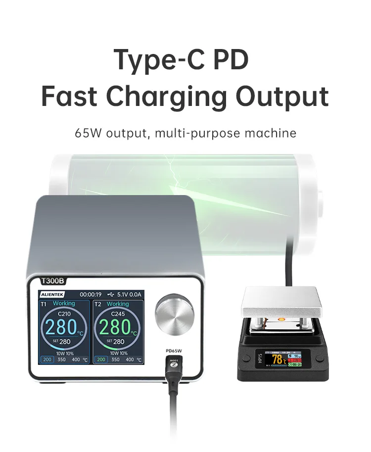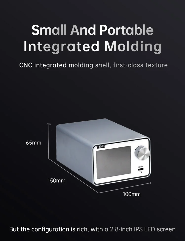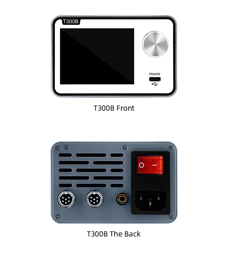 La estación de soldadura T300 Smart cuenta con un transformador toroidal de alta potencia incorporado y admite varios elementos calefactores y manijas, como C115, C210, C245 y T12.También ofrece salida de carga rápida TYPE-C PD y funcionalidad de estación de trabajo dual (modelo T300B), lo que lo convierte en un dispositivo todo en uno versátil.