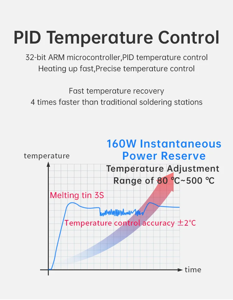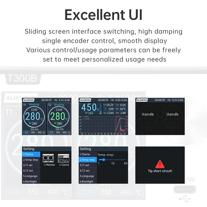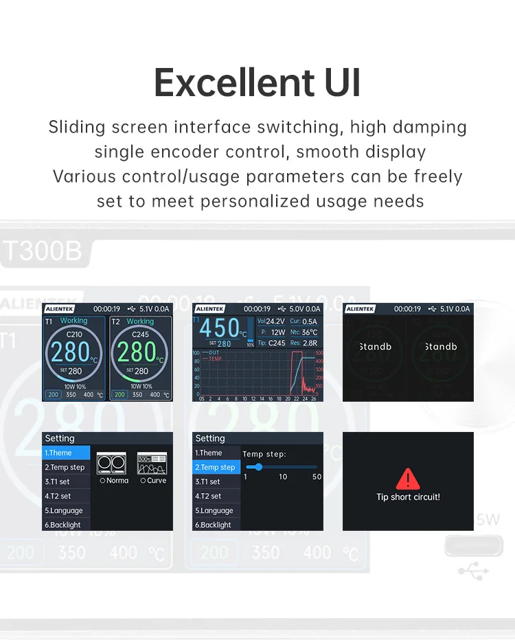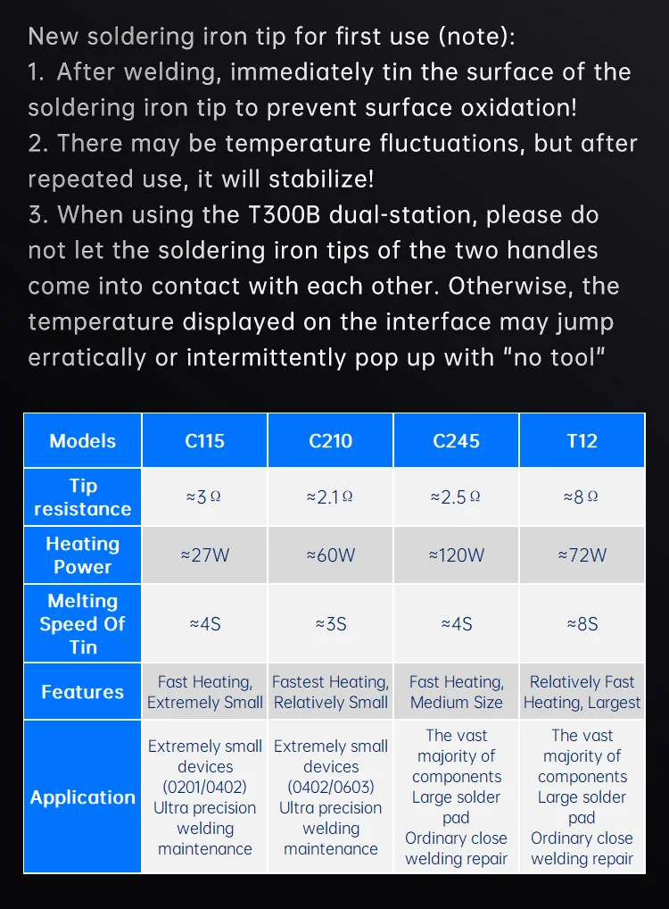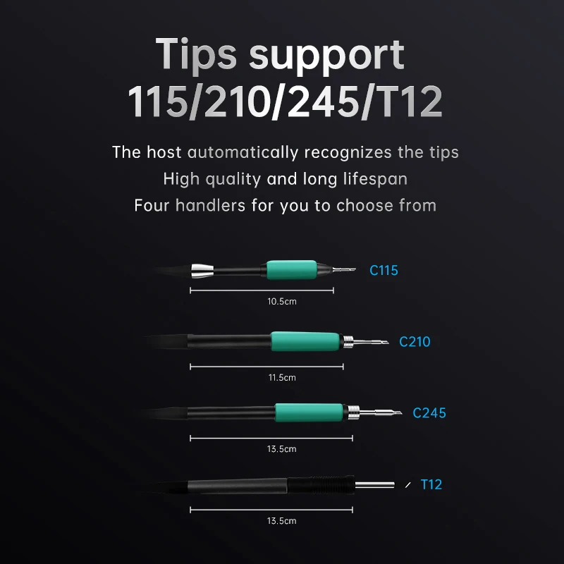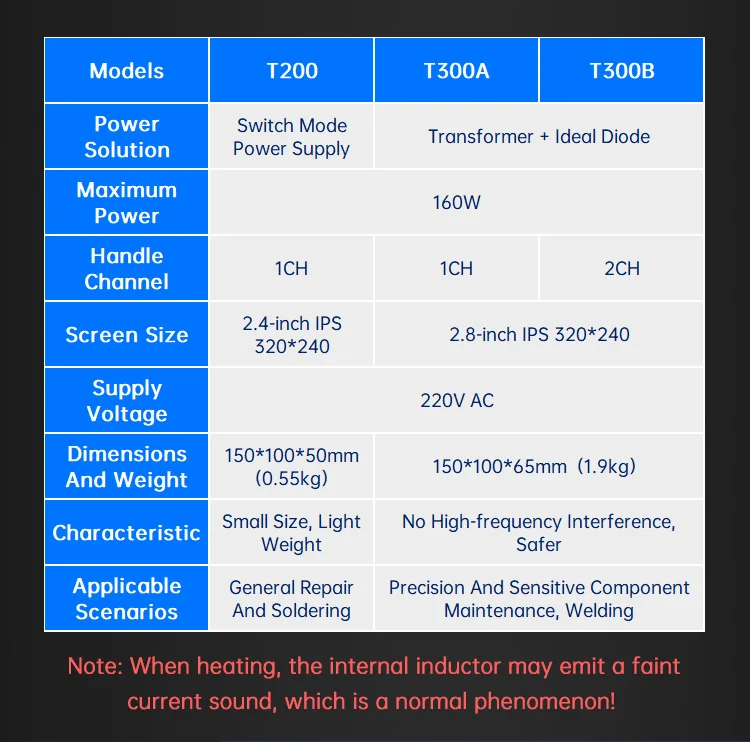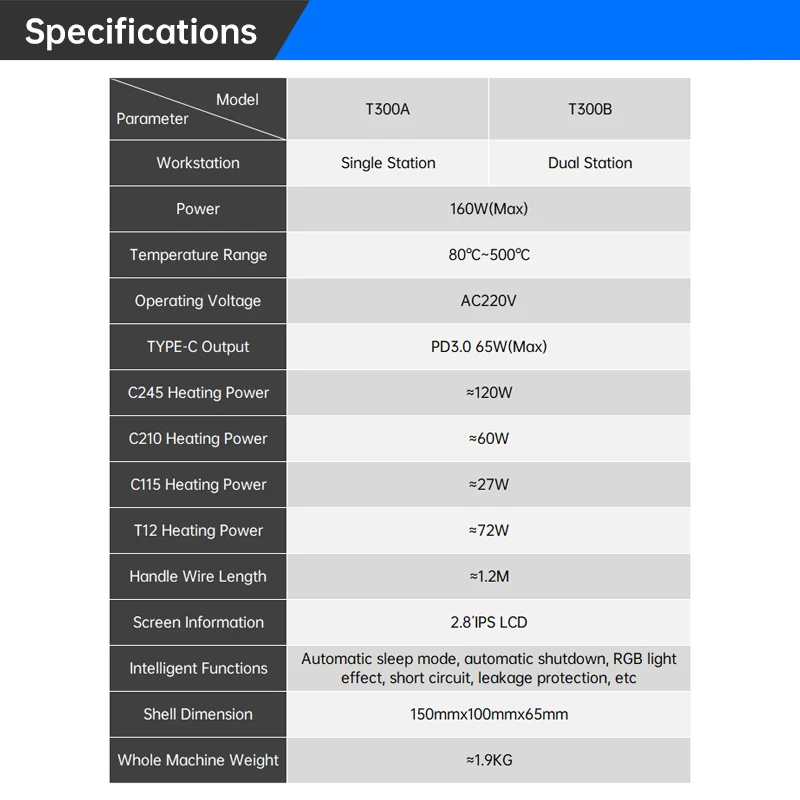 La estación de soldadura T300 Smart cuenta con un transformador toroidal de alta potencia incorporado y admite varios elementos calefactores y manijas, como C115, C210, C245 y T12.También ofrece salida de carga rápida TYPE-C PD y funcionalidad de estación de trabajo dual (modelo T300B), lo que lo convierte en un dispositivo todo en uno versátil.