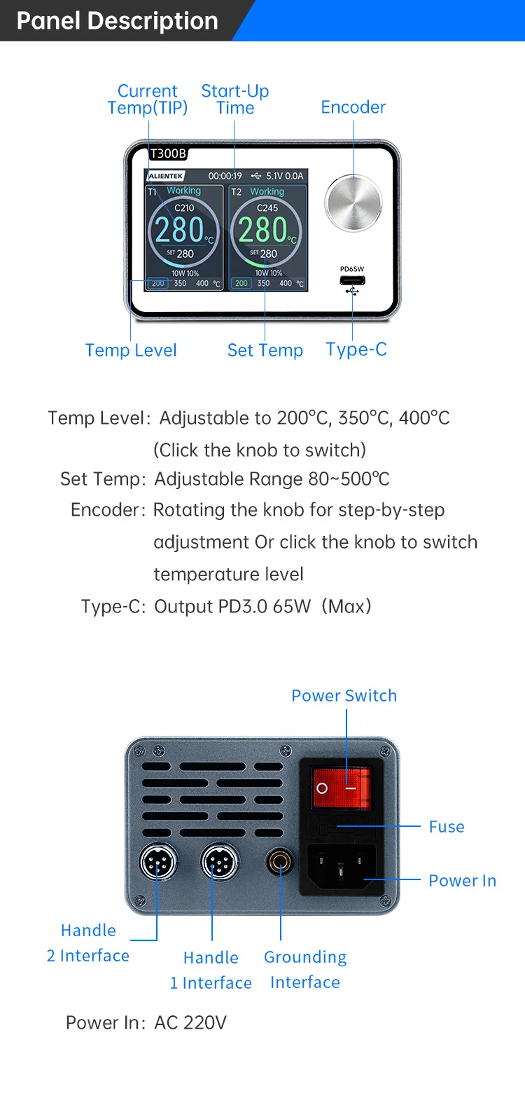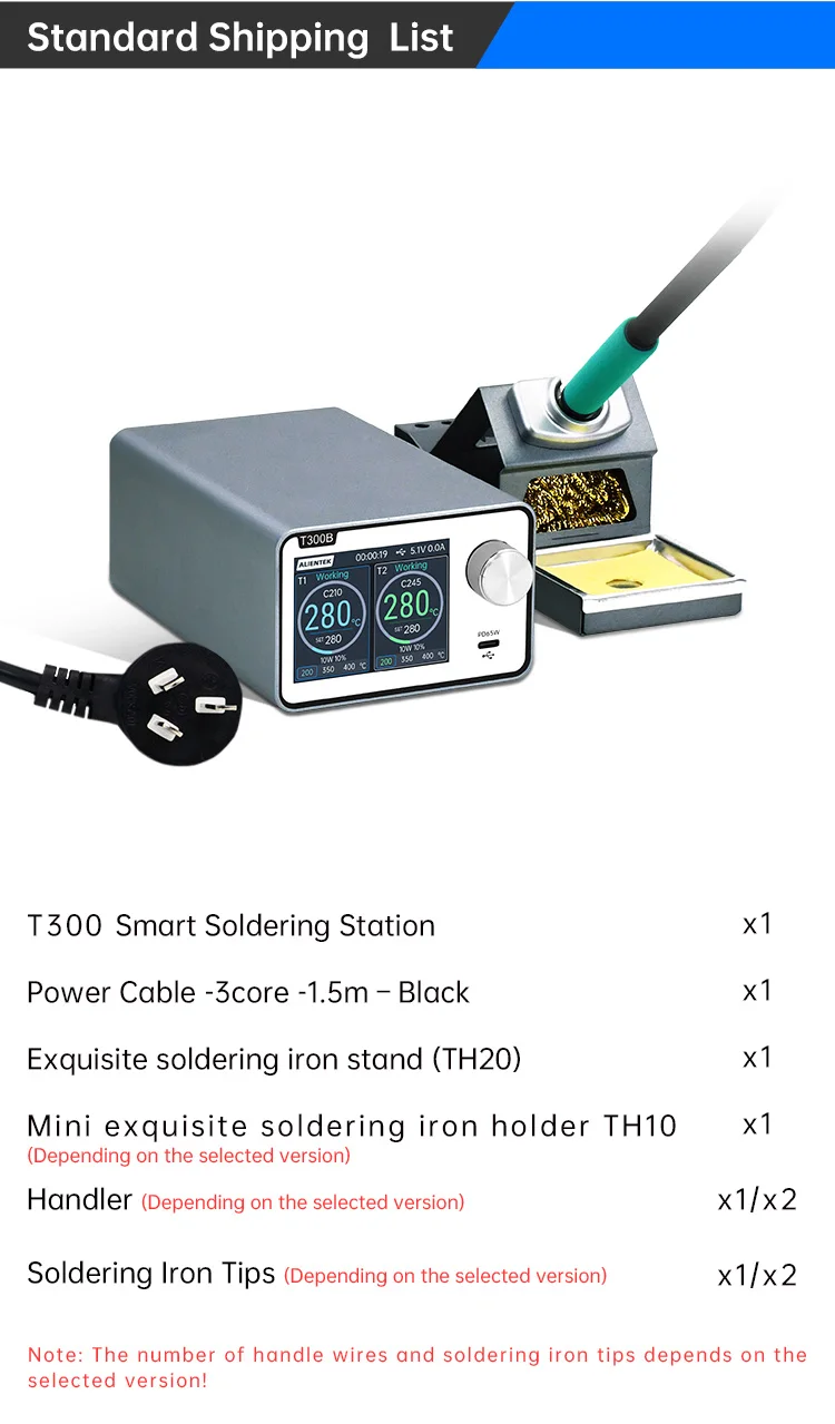 Comprar Estación de soldadura ALIENTEK T300 - 160W, 80~500 ° C, retrabajo doble, admite manijas T12/210/245/115