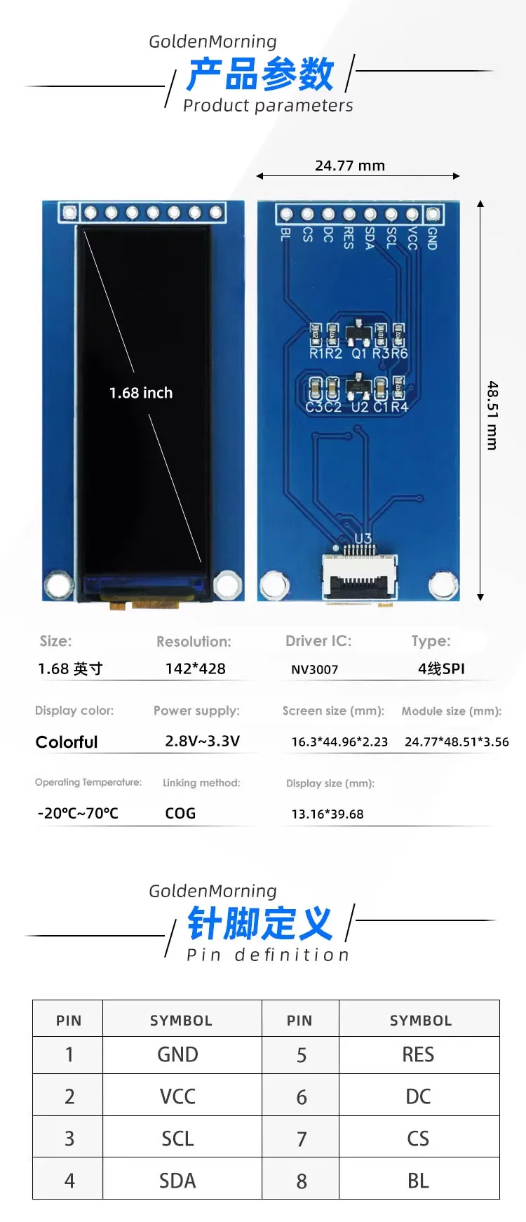 Estardyn Pantalla LCD TFT de 1,68 pulgadas, pantalla pequeña NV3007, pantalla de tira larga 142*428, ángulo de visión completo LCD, pantalla a color SPI