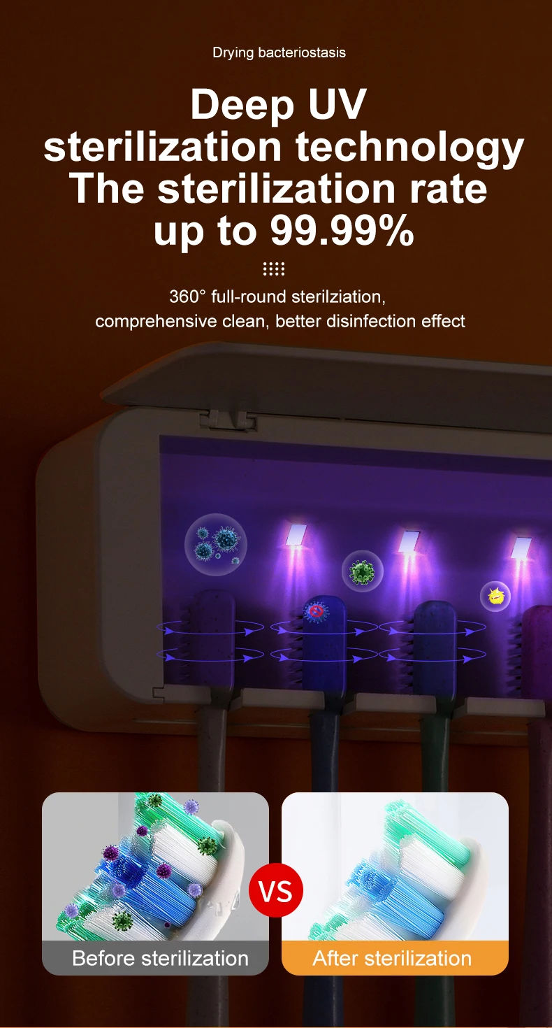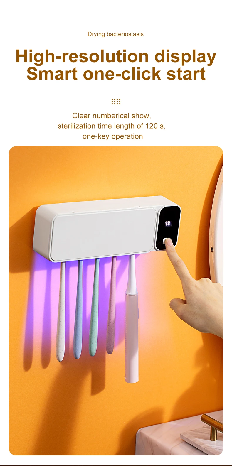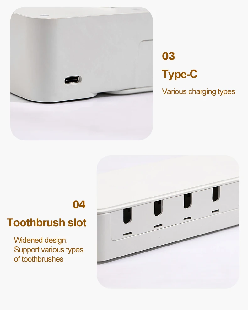 • Esterilización UV :La Función de esterilización UV de este soporte garantiza que sus cepillos estén limpios y libres de gérmenes, lo que le proporciona una experiencia de cepillado higiénico en todo momento.