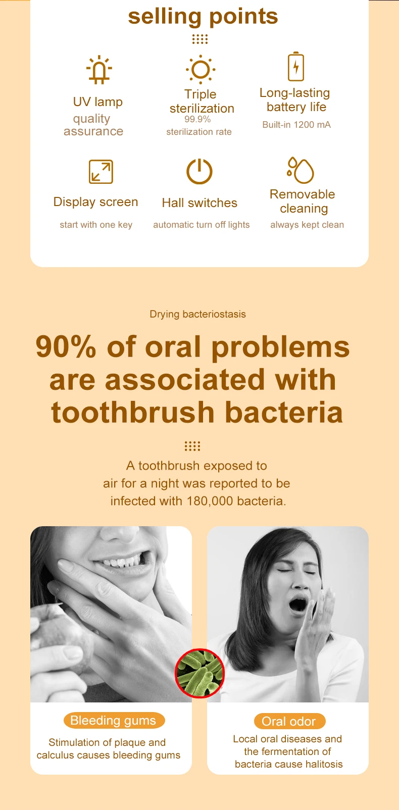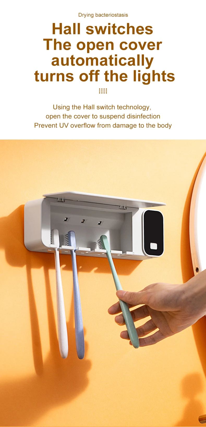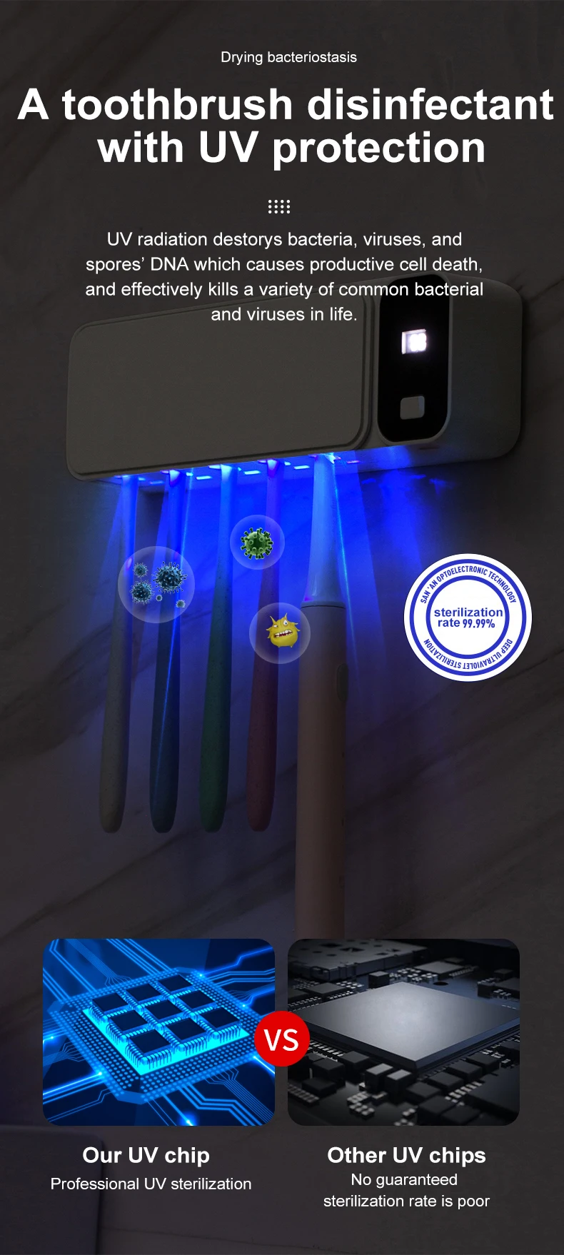 • Esterilización UV :La Función de esterilización UV de este soporte garantiza que sus cepillos estén limpios y libres de gérmenes, lo que le proporciona una experiencia de cepillado higiénico en todo momento.