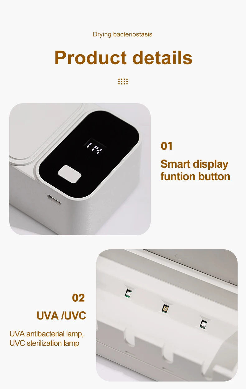 • Característica de secado rápido :El esterilizador de cepillo de dientes UV cuenta con una función de secado rápido, asegurando que sus cepillos estén listos para usar nuevamente en poco tiempo. Ideal para mañanas ocupadas o para aquellos que prefieren cambiar sus pinceles con frecuencia.