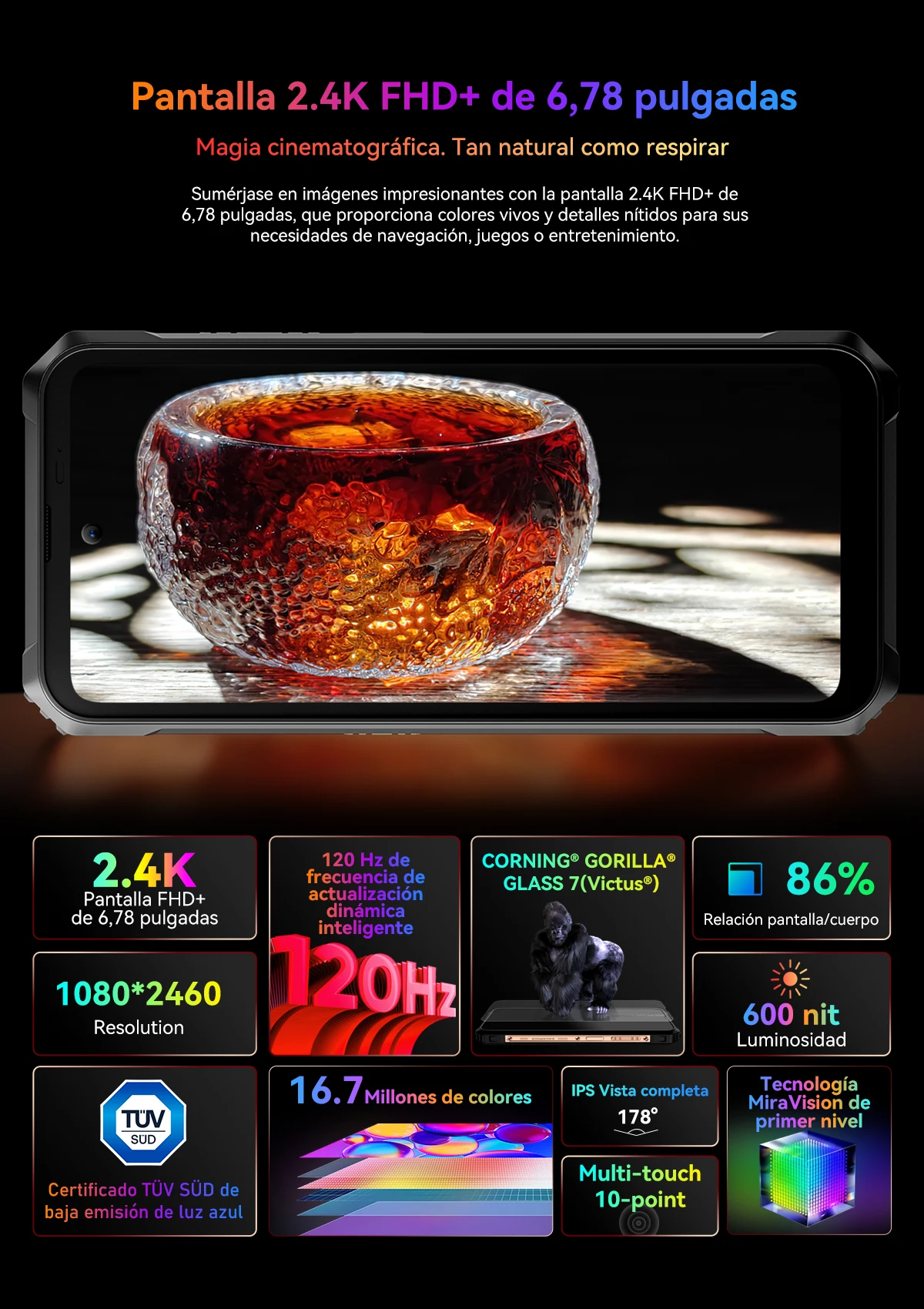 Pantalla principal:6,78 pulgadas FHD +, resolución de 1080*2460, orningo Gorillao Glass Victus, frecuencia de actualización de 120Hz