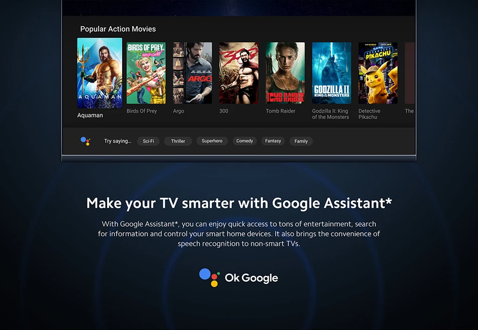 Con Google Assistant*, podrás disfrutar de un acceso rápido a toneladas de entretenimiento, buscar información y controlar tus dispositivos domésticos inteligentes.También aporta la comodidad del reconocimiento del habla a televisores no inteligentes.