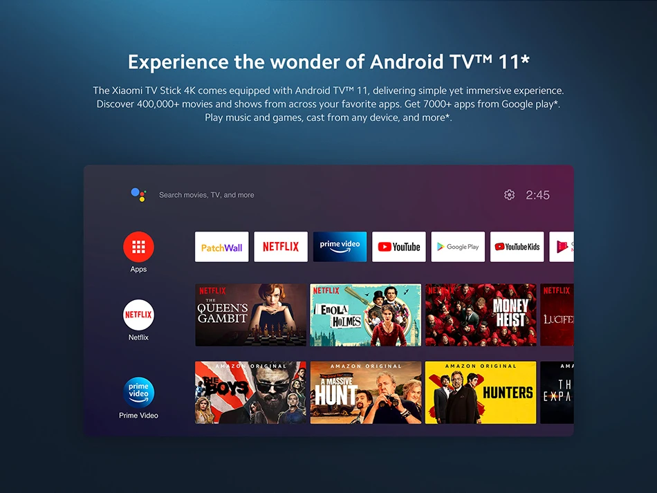 El Xiaomi TV Stick 4K viene equipado con Android TV™ 11, brindando una experiencia simple pero inmersiva.Descubra más de 400.000 películas y programas desde todas sus aplicaciones favoritas.Obtenga más de 7000 aplicaciones de Google Play*.Reproduzca música y juegos, transmita desde cualquier dispositivo y más*.