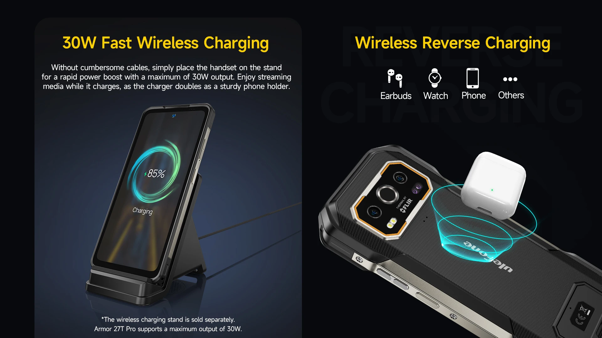 Soporte 30WCarga inalámbrica(16V1.5A, Protocolo privado Ulefone)Примечание: При беспроводной зарядке WCS01 мощность может достигать только 30 Вт