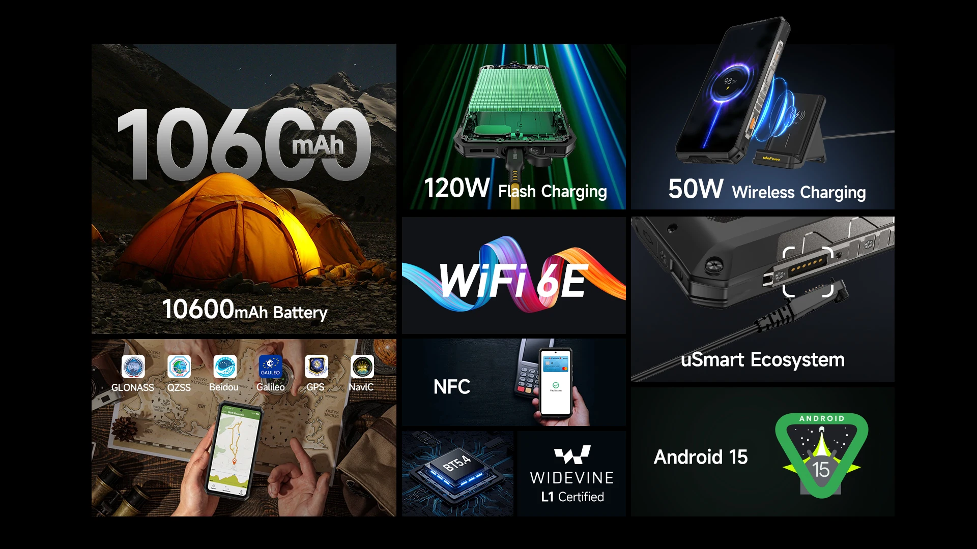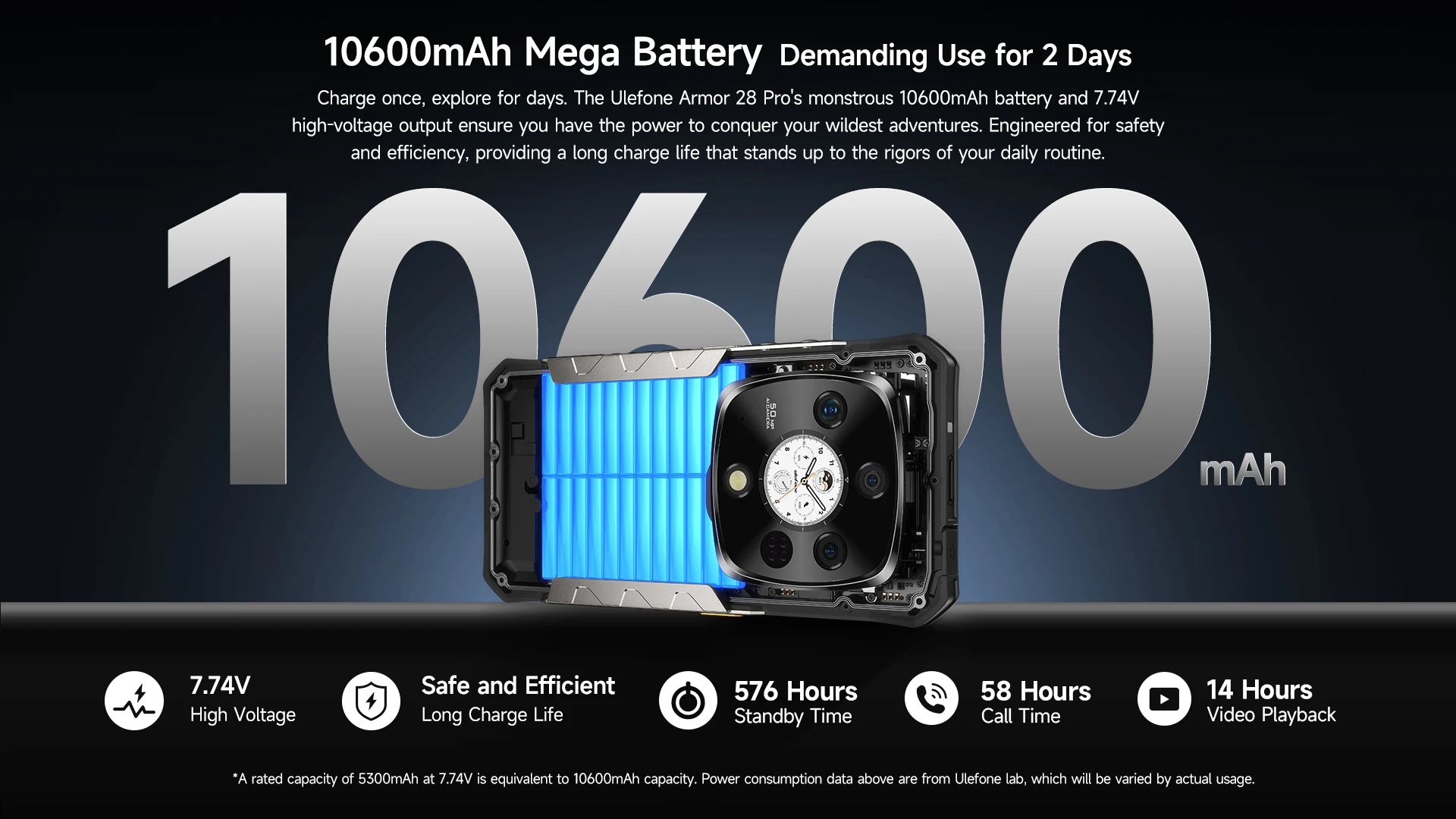 *Una capacidad nominal de 5300 mAh a 7,74 V equivale a una capacidad de 10600 mAh.Los datos de consumo de energía anteriores son del laboratorio Ulefone, que variarán según el uso real.
