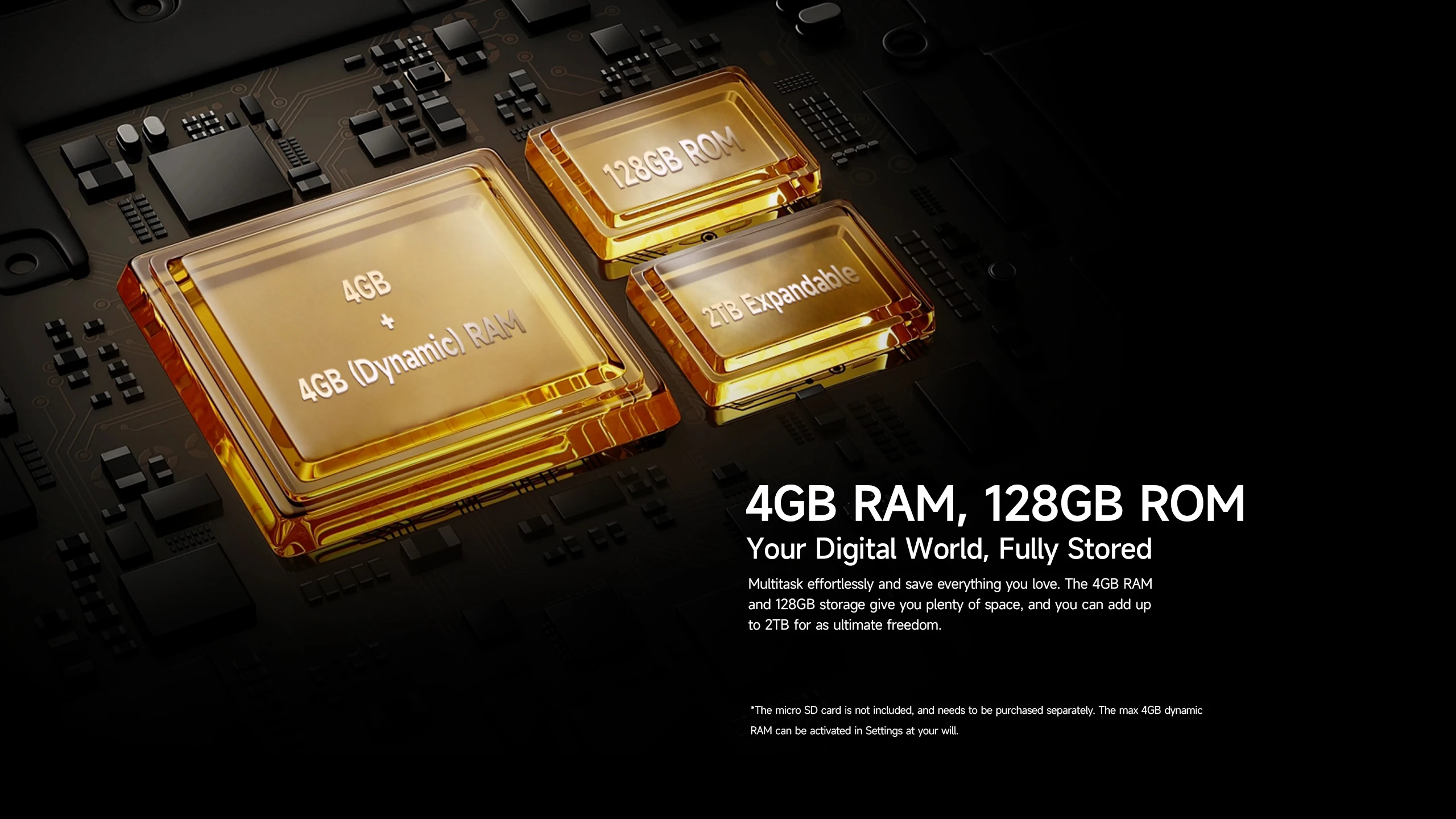Multitarea sin esfuerzo y guarda todo lo que amas.Los 4 GB de RAM y 128 GB de almacenamiento le brindan mucho espacio y puede agregar hasta 2 TB para obtener la máxima libertad.
