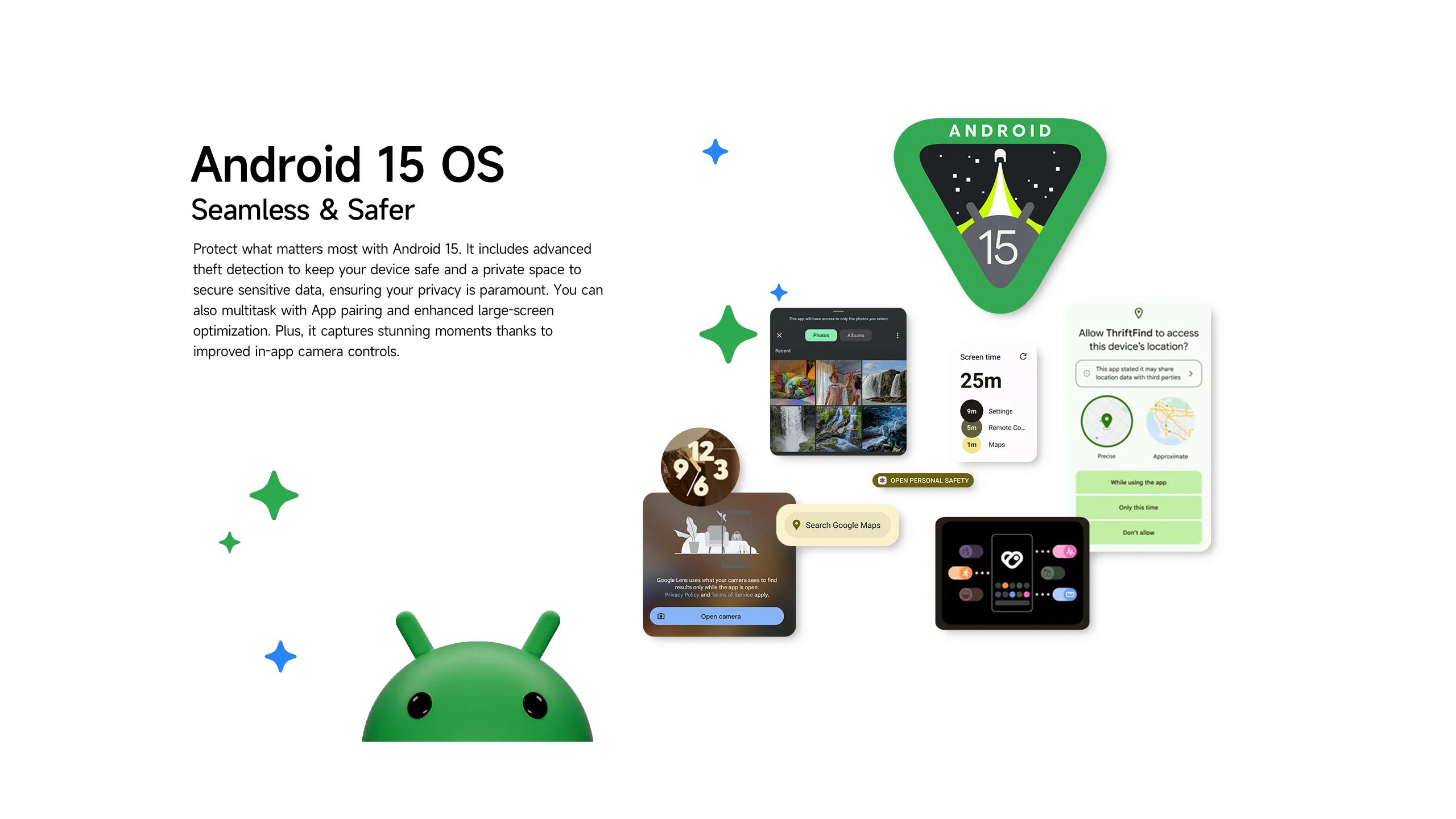 Proteja lo que más importa con Android 15.Incluye detección de robo avanzada para mantener su dispositivo seguro y un espacio privado para asegurar datos confidenciales, garantizando que su privacidad sea primordial.También puede realizar múltiples tareas con el emparejamiento de aplicaciones y la optimización mejorada en pantalla grande.Además, captura momentos impresionantes gracias a los controles mejorados de la cámara en la aplicación.