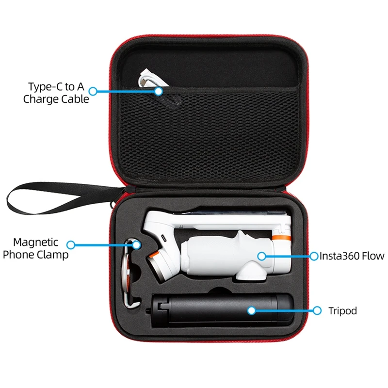 Esta bolsa de almacenamiento portátil está diseñada específicamente para Insta360 Flow, con un interior moldeado a medida y ranuras y bolsillos de almacenamiento especiales para su dispositivo y accesorios.