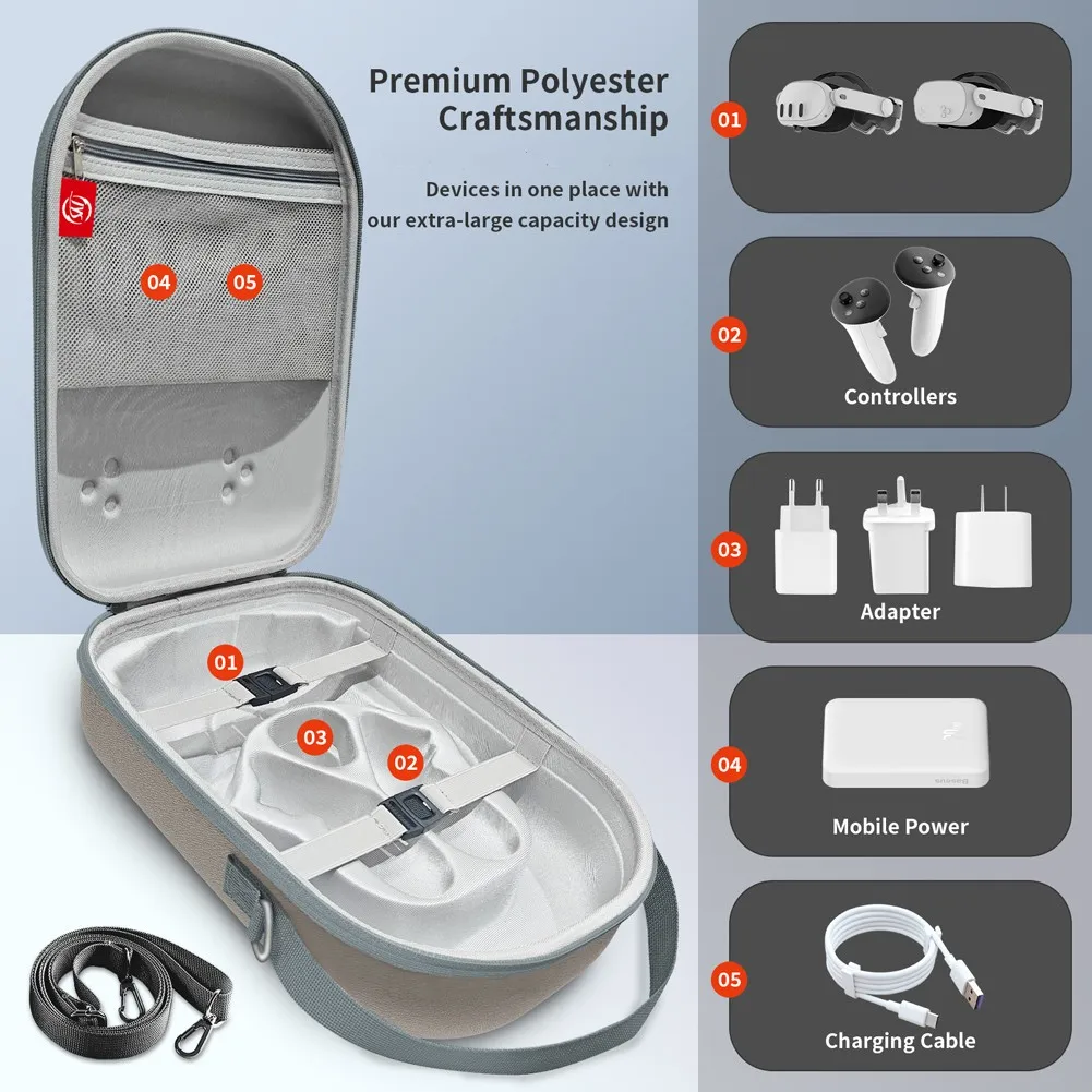 3.Amplia capacidad:La caja de almacenamiento presenta un diseño de gran capacidad, capaz de almacenar la unidad principal, los controladores, el cargador, el banco de energía y los cables de carga simultáneamente, manteniendo organizados todos sus elementos esenciales de realidad virtual.