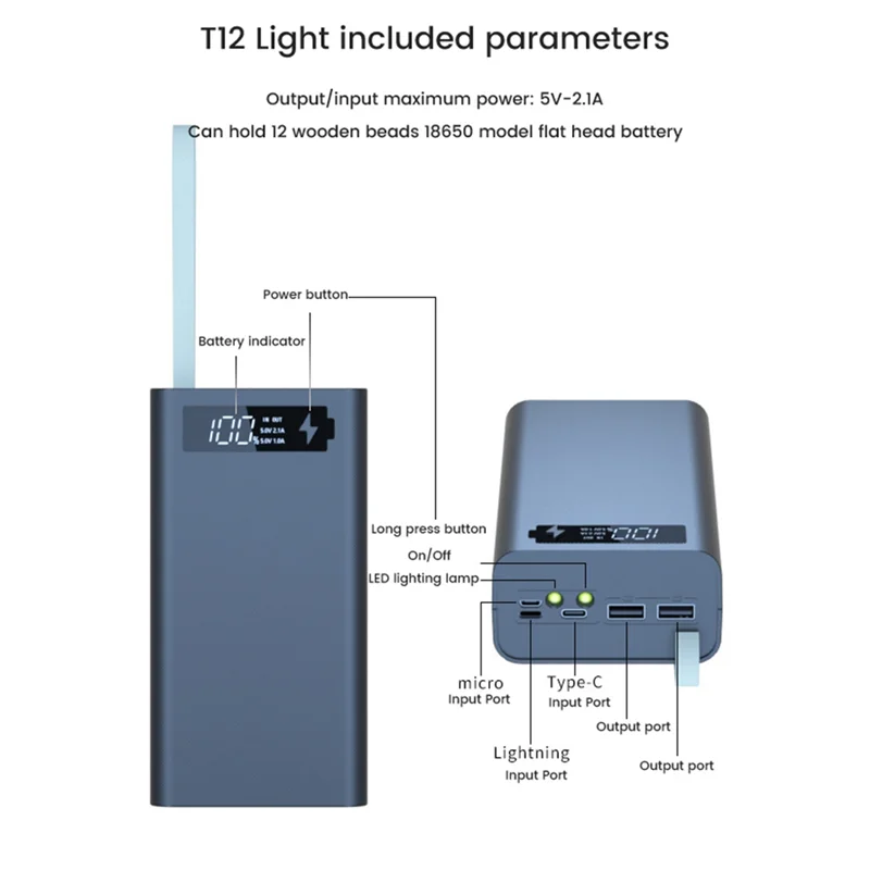 T12 con luz: potencia máxima de salida/entrada: 5V-2.1A