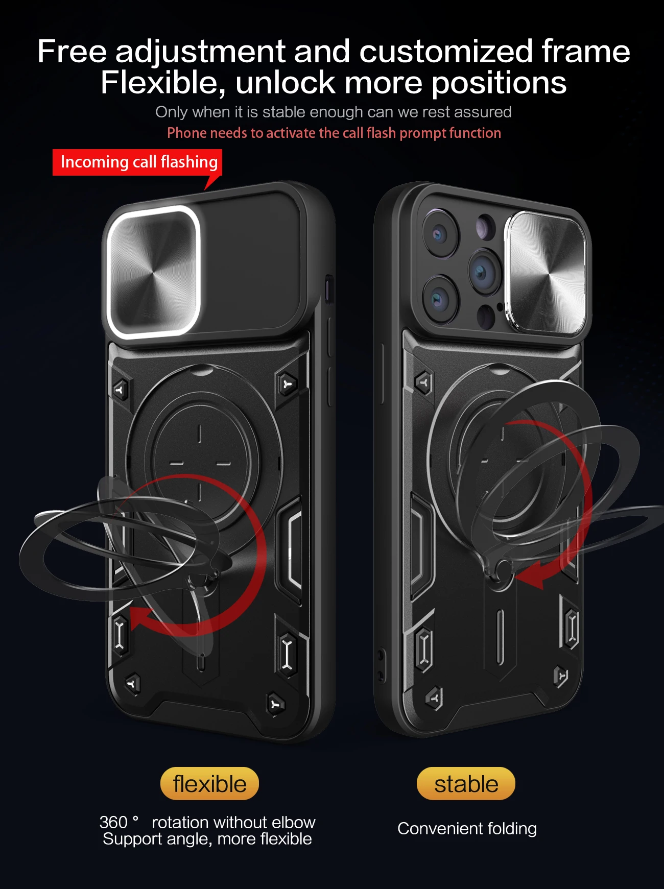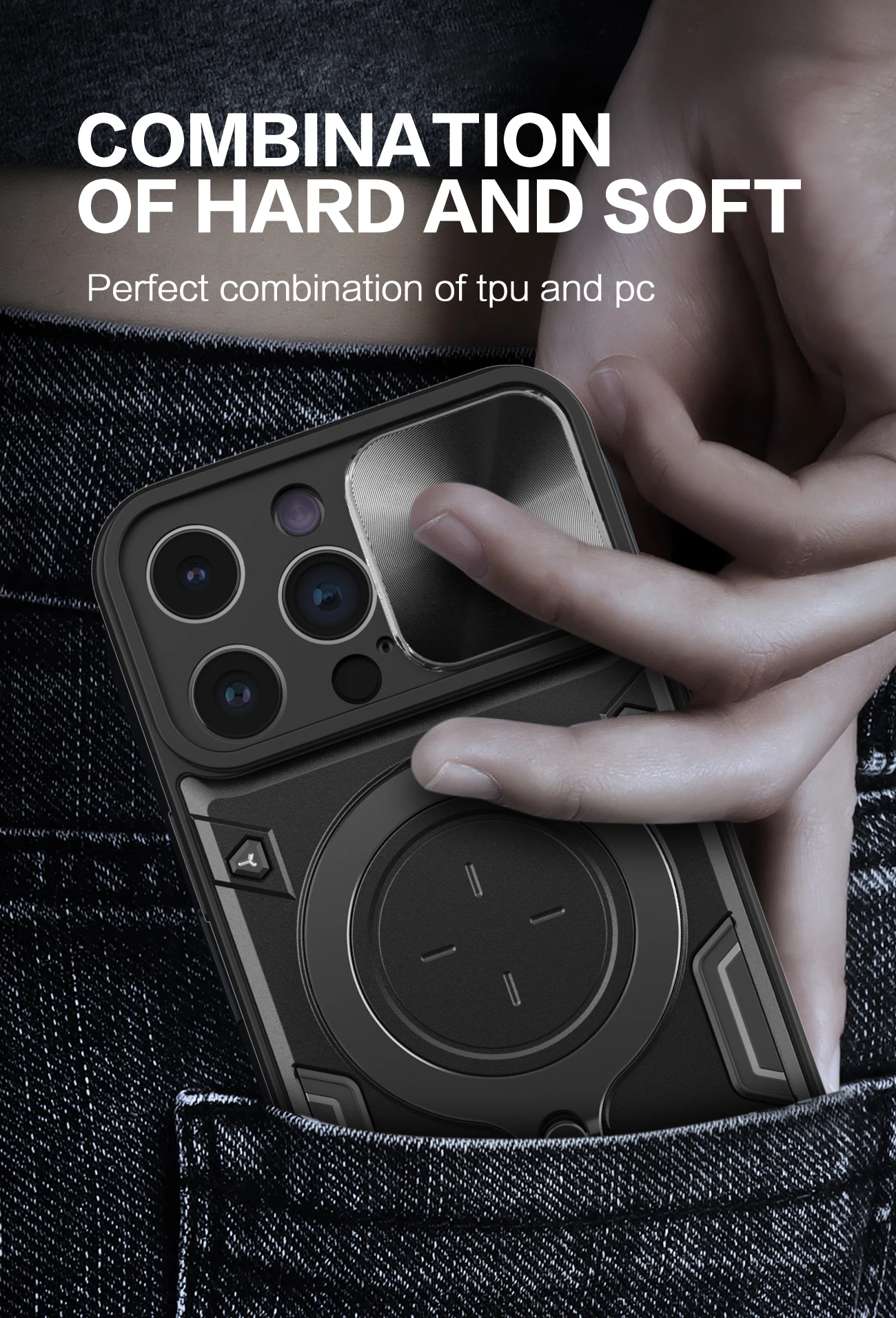 Material: PC + TPU Función: combinación 2 en 1 de suave y duro, antiarañazos, anticaída, antihuellas dactilares, Protección de lente de ventana de empuje, succión magnética montada en el automóvil, soporte giratorio de 360 grados, tira de luz ambiental para llamadas entrantes intermitentes