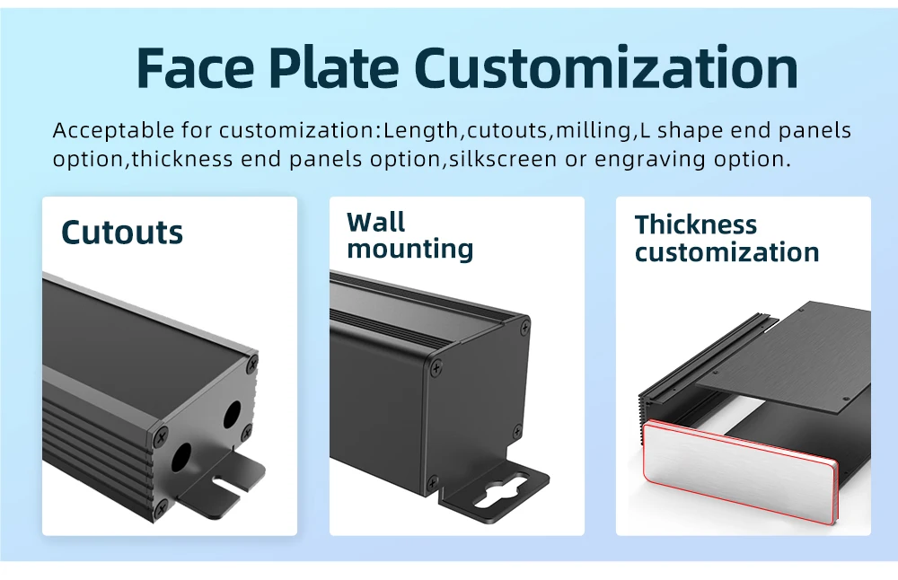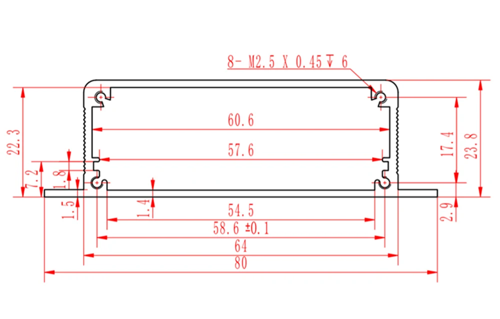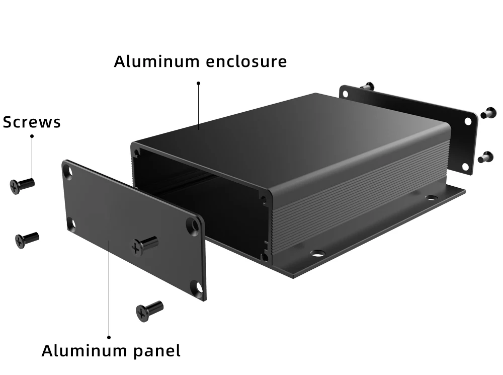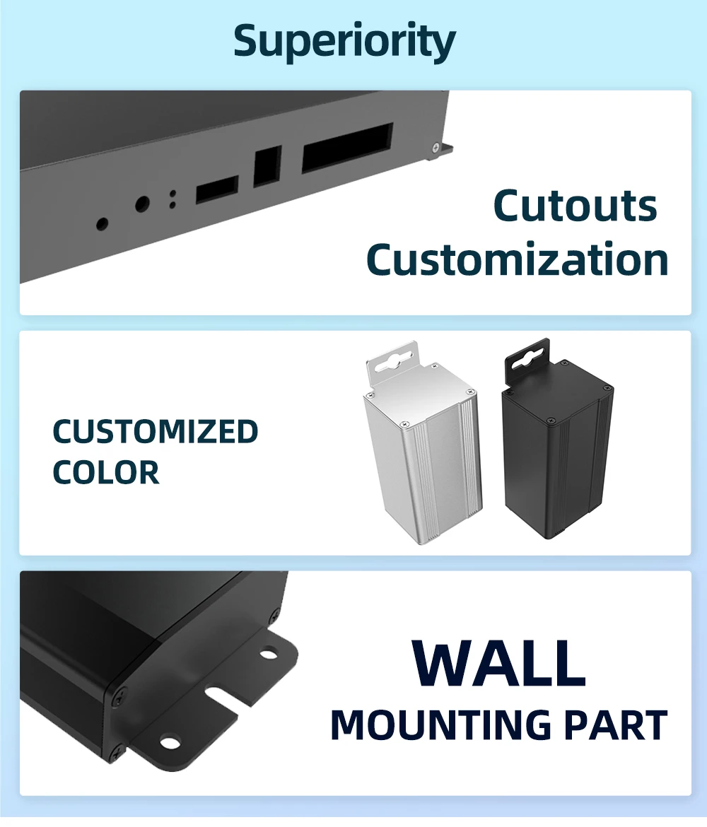 La caja consta de tres partes: carrocería + panel delantero/trasero + 8 tripulaciones, se aplican materiales al6063s. El diseño interna de la ranura para tarjetas es simple para montar en la PCB. Es ampliamente utilizado en equipos, monitoreo y pruebas ambientales, monitoreo y pruebas ambientales, control industrial, transporte ferroviario, terminales de vehículos, seguridad y protección, electrónica, dispositivos y mostradores industriales.Características: