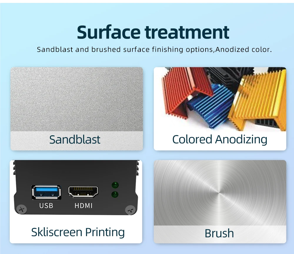 1. Diseñado para acomodar tableros o equipos P.C.2. Opciones de uso general, impermeable, protección contra interferencias electromagnéticas o disipación de calor3. Opciones de acabado de superficie de chorro de arena y cepillado, color anodizado4.P.C. Las tablas se fijan horizontalmente, insertándolas en las ranuras internas extruidas en el cuerpo de la carcasa.5. Se acepta la personalización: longitud, recortes, fresado, opción de paneles finales en forma de L, opción de grosor de los paneles finales, posibilidad de serigrafía o grabado.Especificaciones: