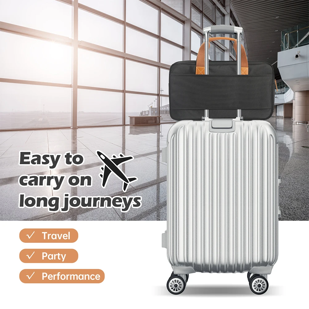 3.Amplia capacidad:Esta bolsa de alta capacidad es una opción inteligente para los entusiastas de la música profesionales.Su asa de PU resistente y cómoda, junto con la cremallera de PU, permiten un fácil transporte.Puede llevarlo en la mano o sujetarlo de forma segura a su equipaje, lo que lo hace conveniente para actuaciones, fiestas y viajes.