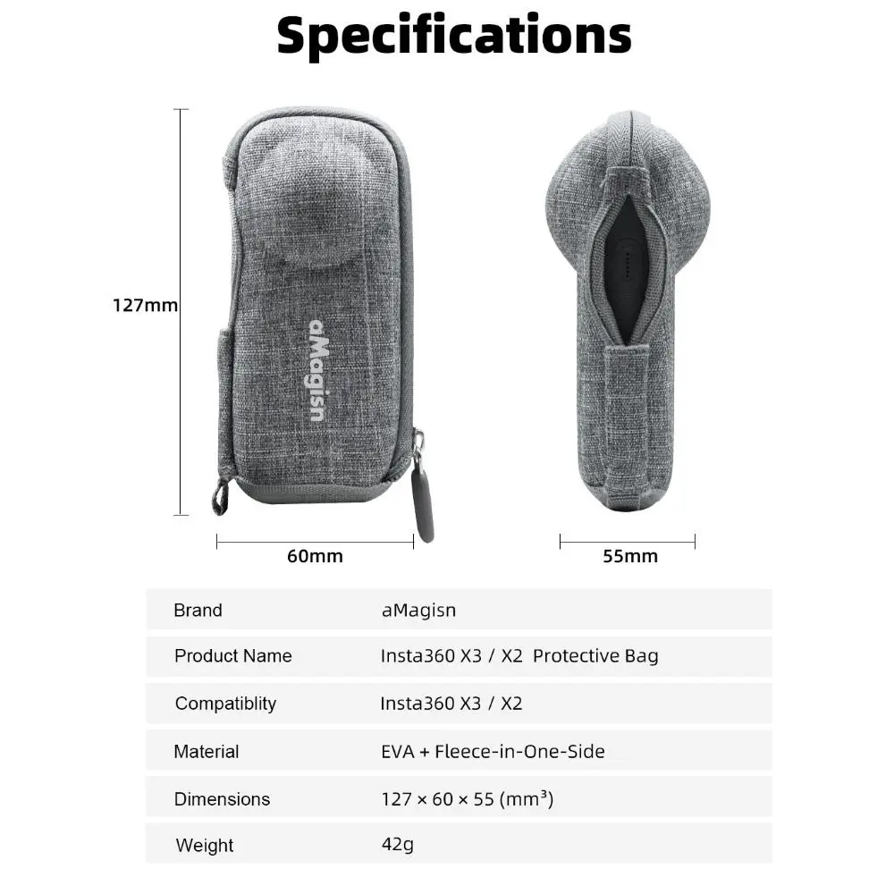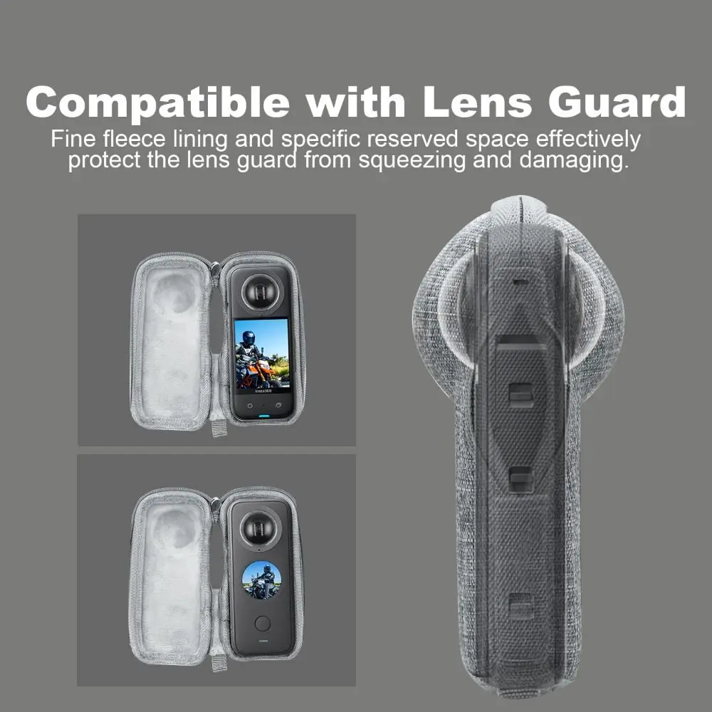 Especialmente diseñado para la bolsa de almacenamiento Insta360 X3/X2, muy portátil y de almacenamiento. Diseño de apertura lateral, para que la cámara se pueda almacenar en el estuche de la Cámara cargando en cualquier momento, muy conveniente. Diseño inferior, para que la cámara en el caso de almacenamiento también se pueda vincular al palo de selfie, bastante conveniente. Espacio reservado del espejo de protección de la lente para evitar daños en la extrusión del espejo de protección de la lente. Solo bolsa de almacenamiento, ¡otros accesorios de demostración en la imagen no están incluidos! Parámetros del producto: Nombre del producto: Bolsa protectora X3 / X2 Compatibilidad: Para Insta360 X3 / X2 Material: EVA + Fleece-in-One-Side Dimensiones: 127 × 60 × 55 (sup3 mm &;) Peso: 42G Lista de productos: 1 * Bolsa de almacenamiento