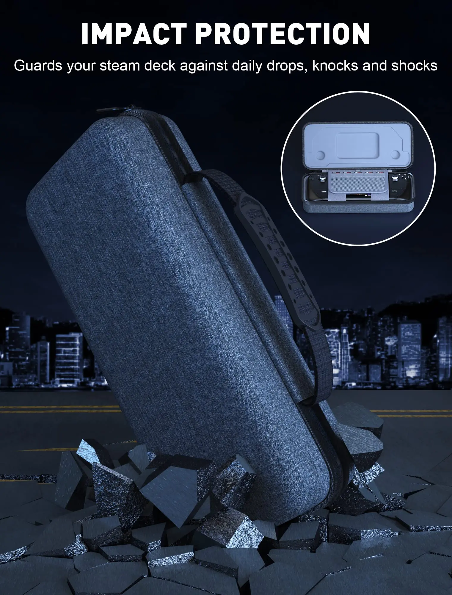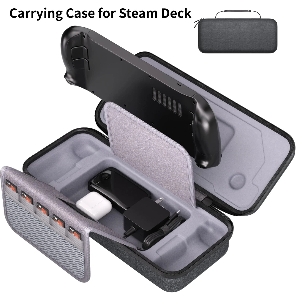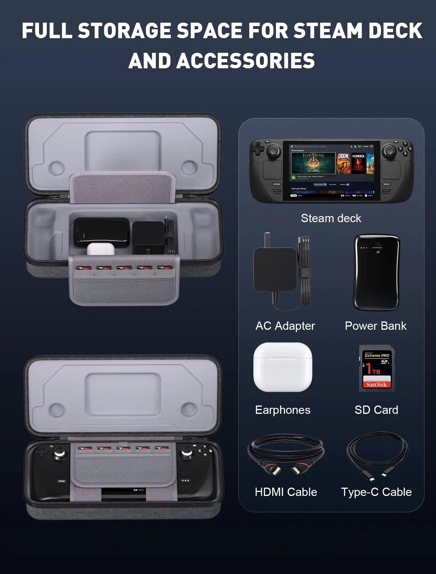 1.Estuche de almacenamiento Steam Deck: diseñado para adaptador de cargador de CA Steam Deck y Steam Deck, banco de energía, tarjeta mini SD, mouse inalámbrico y otros accesorios.