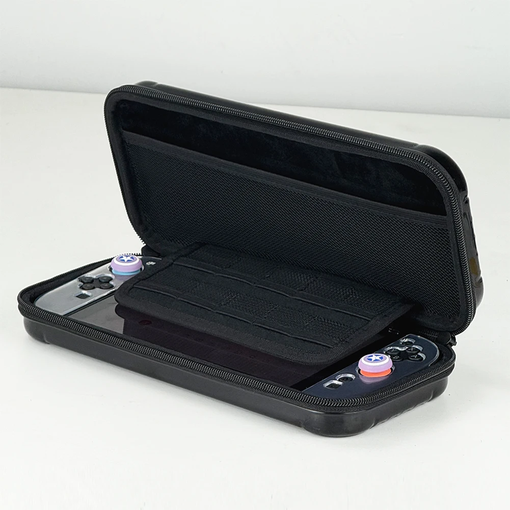 3.Uso del espacio optimizado:Más allá del compartimento principal del Switch 2, este estuche de viaje cuenta con múltiples ranuras para tarjetas y bolsillos de malla para guardar tarjetas de juego y cables de carga.La correa de seguridad del compartimento inferior estabiliza la consola y la hace fácilmente accesible.